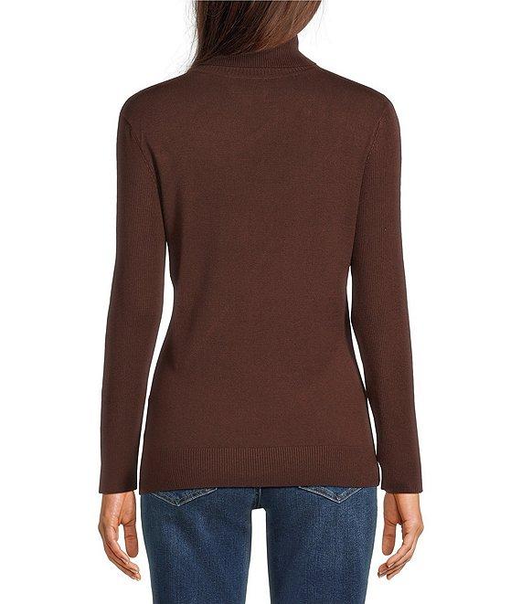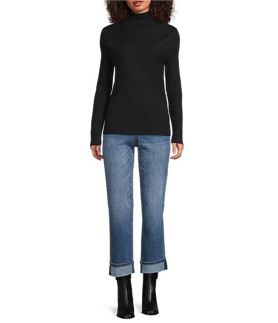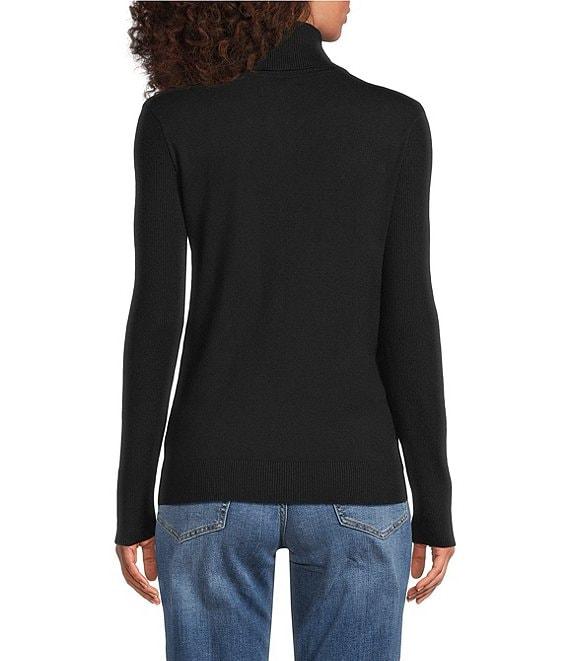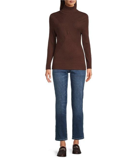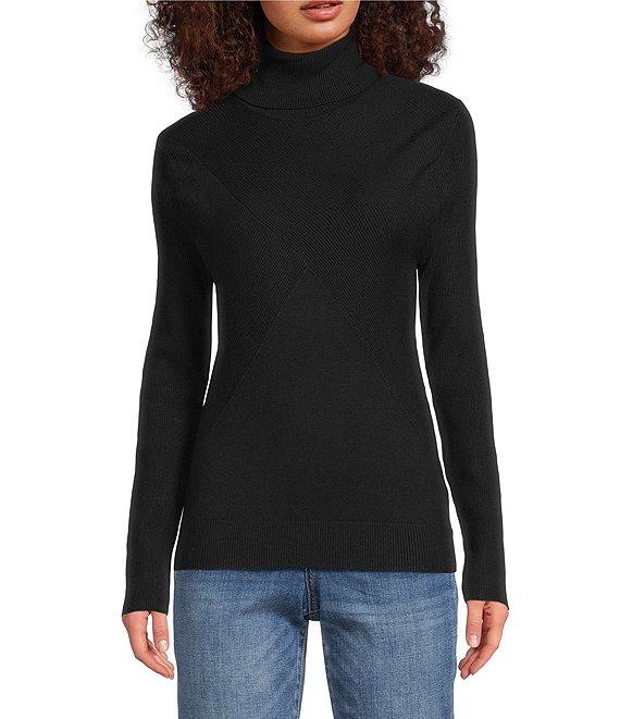 From Liverpool Los Angeles, this sweater features: Ribbed jersey knit fabrication Turtle neckline Long sleeves Straight hemline Pullover construction Approx. 24" length Viscose/nylon Machine wash Imported.