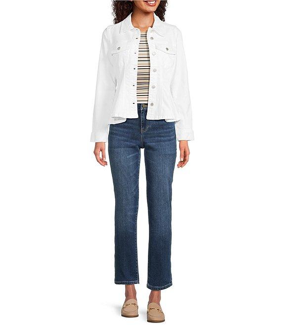 From Liverpool Los Angeles, this trucker jacket features: Stretch denim fabrication Peplum silhouette Point collar neckline Long sleeves Chest pockets Peplum hemline Front button closure Approx. 24" length Modal/T400/elasterell/lycra Machine wash Imported.