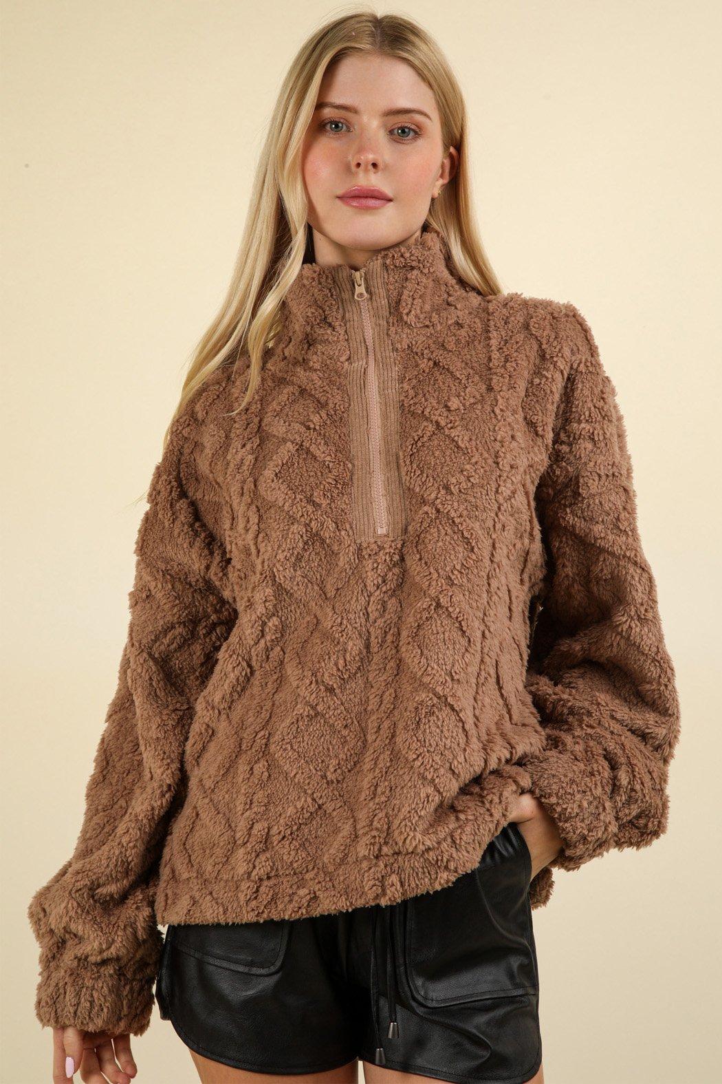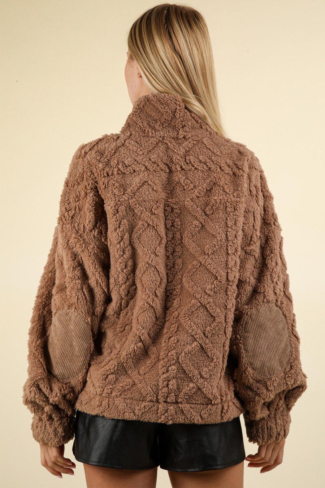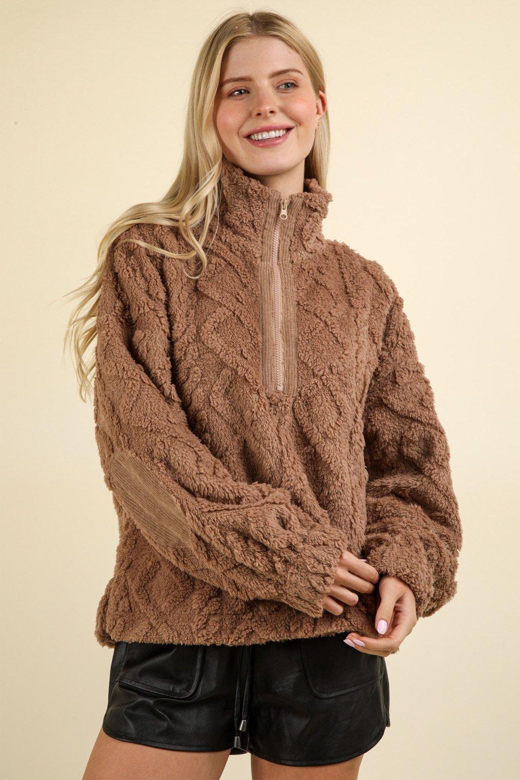 This ultra cozy plush quarter zip top features a diamond textured pattern and corduroy elbow patch detail. Throw this neutral colored zip up on with your pajamas for a warm and cozy look or dress it up with a white crewneck underneath and jeans for running errands.