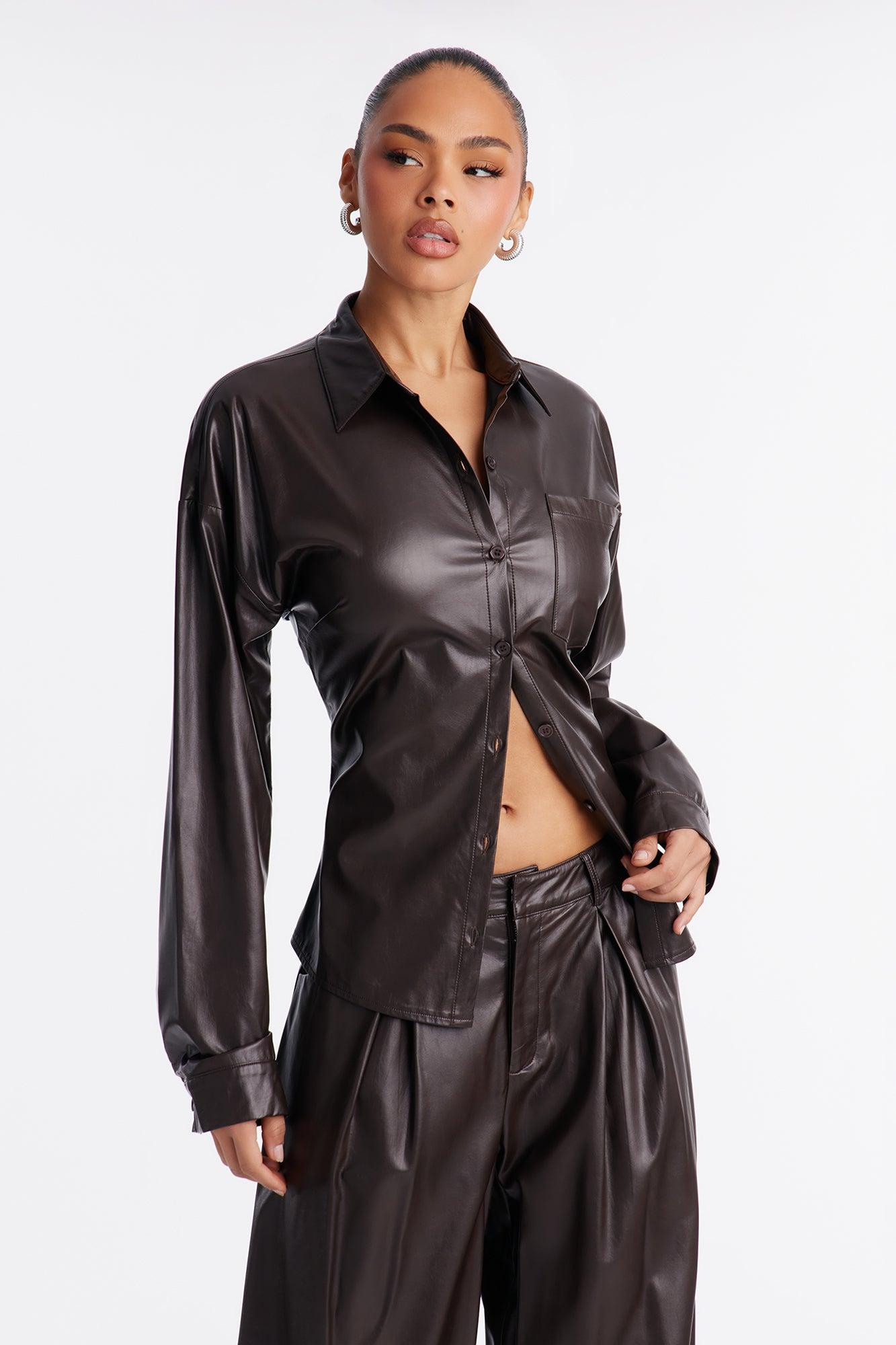 Available In Brown. 2 Piece Ensemble Button Up Shirt And Wide Leg Pant Set Stretch Inseam 32" Back Shirt Lace Up Detail Pockets Front Closure With Fly Zipper On Pants 55% Cotton 45% Polyurethane Imported California Proposition 65WARNING: Cancer and Reproductive Harm - www.P65Warnings.ca.gov.