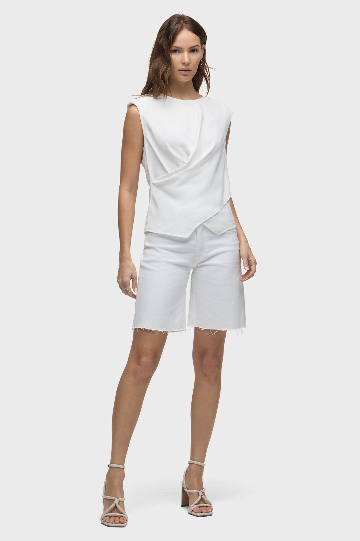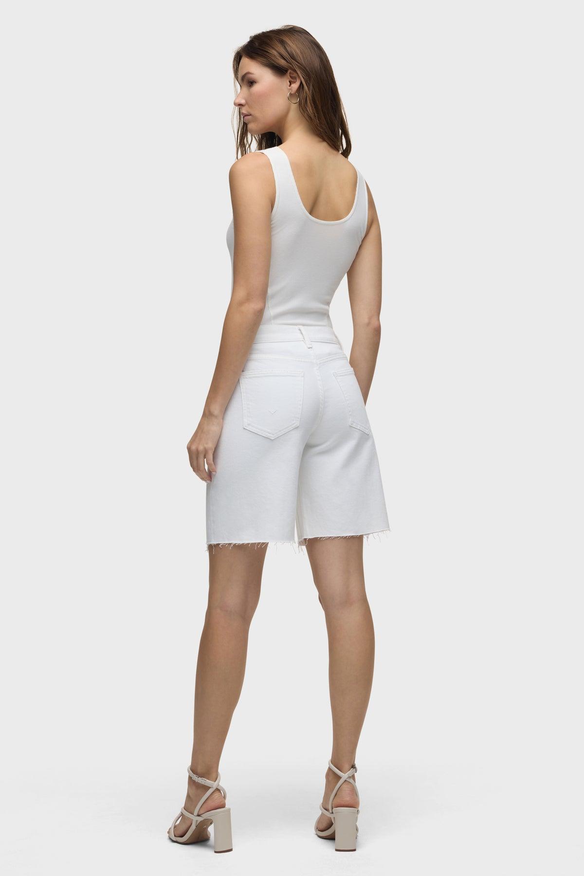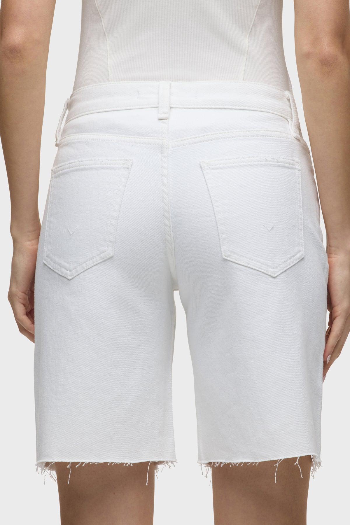 Description The London Low-Rise Long Short in White is our latest five-pocket short. This casual short has a relaxed, dropped fit and a 9" inseam with a raw hem. This pair is made of premium comfort low-stretch denim in a clean white shade. Size up for a looser fit. Product Details Front Rise: 10.5", Leg Opening: 23", Inseam: 9"Model Height 5'9"Model wearing size 25Measurements based on size 27 Fit & Care Content: 75% Cotton, 10% Wafer, 10% T400, 4% Tencel, 1% LycraMachine wash cold with like colorsDo not bleachTumble dry low or hang to dry