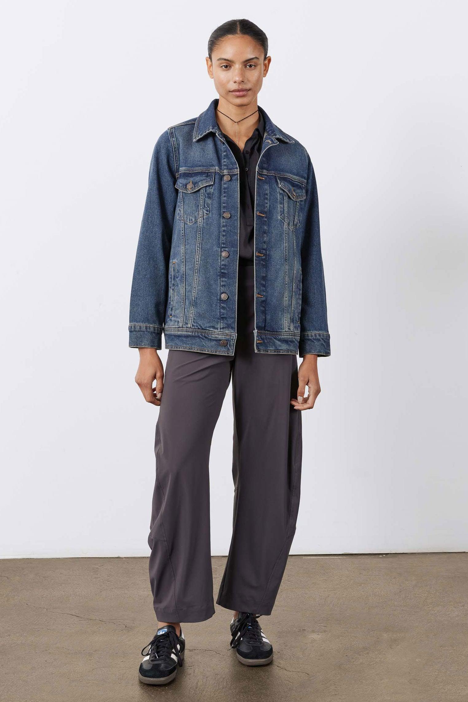 This long line denim jacket offers a modern, laid-back silhouette with timeless edge. Designed to layer with ease, it adds structure and versatility to any outfit.