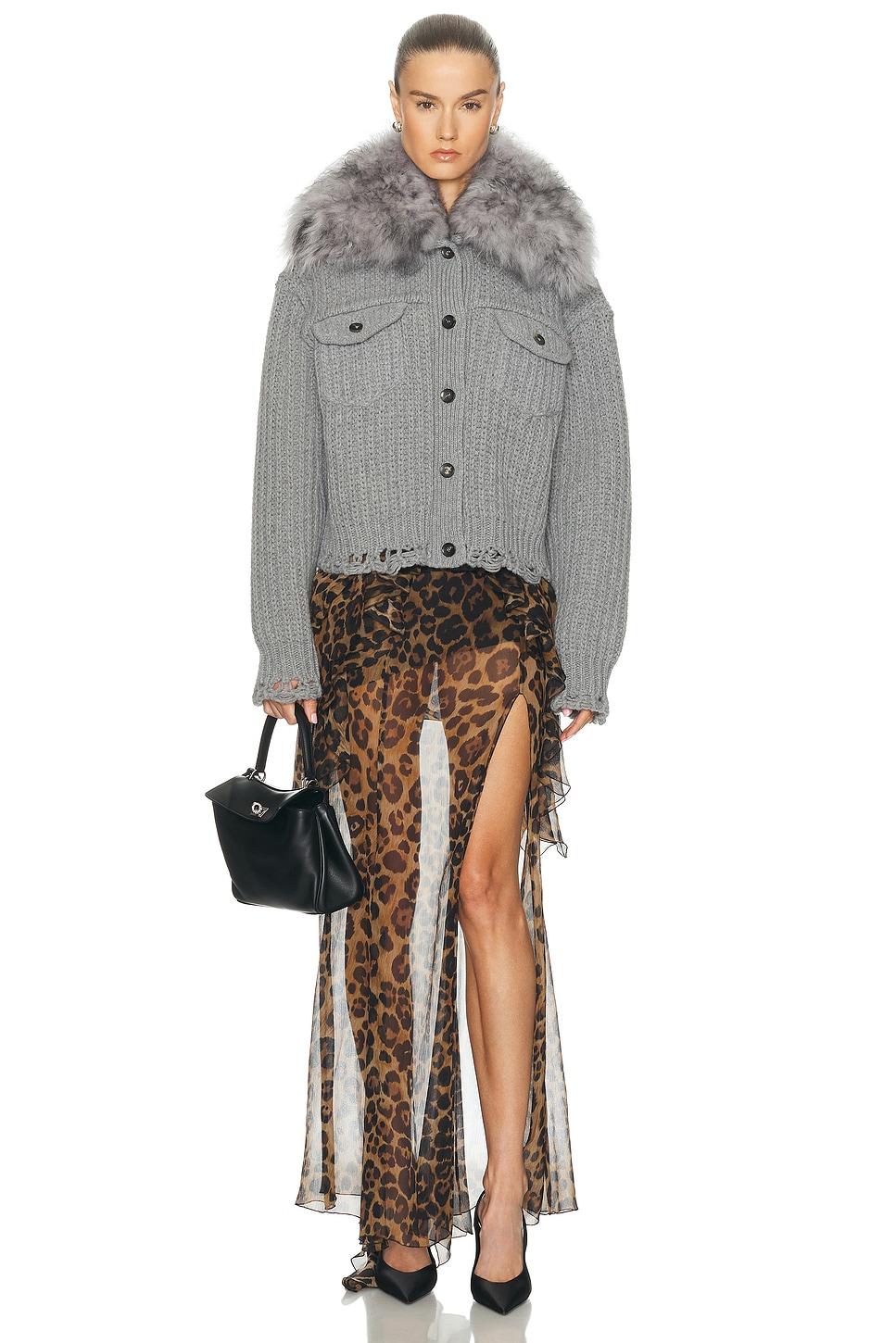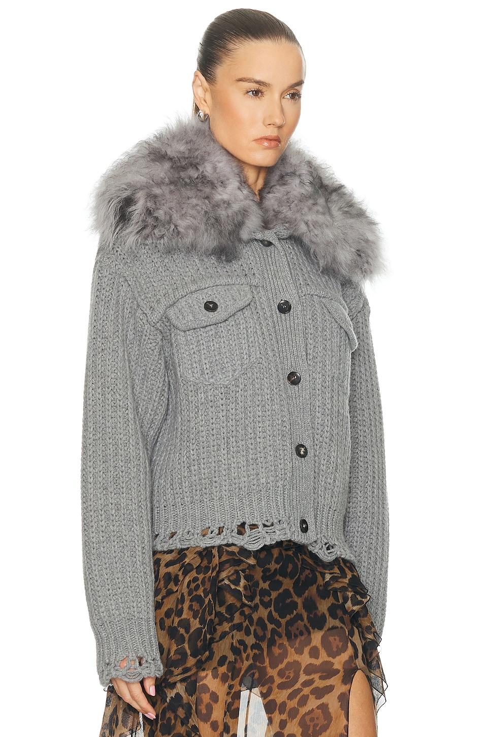 cardiganSelf: 90% wool, 10% cashmereContrast Fabric: 100% dyed lamb fur / Fur Origin: China / Dry clean only / Front button closure / Detachable fur collar / Midweight knit fabric with distressed trim / This item is not available for international export / Made in Italy / Our Style No. BMAF-WK36 / Manufacturer Style No. A522M602A / Model is wearing size S.