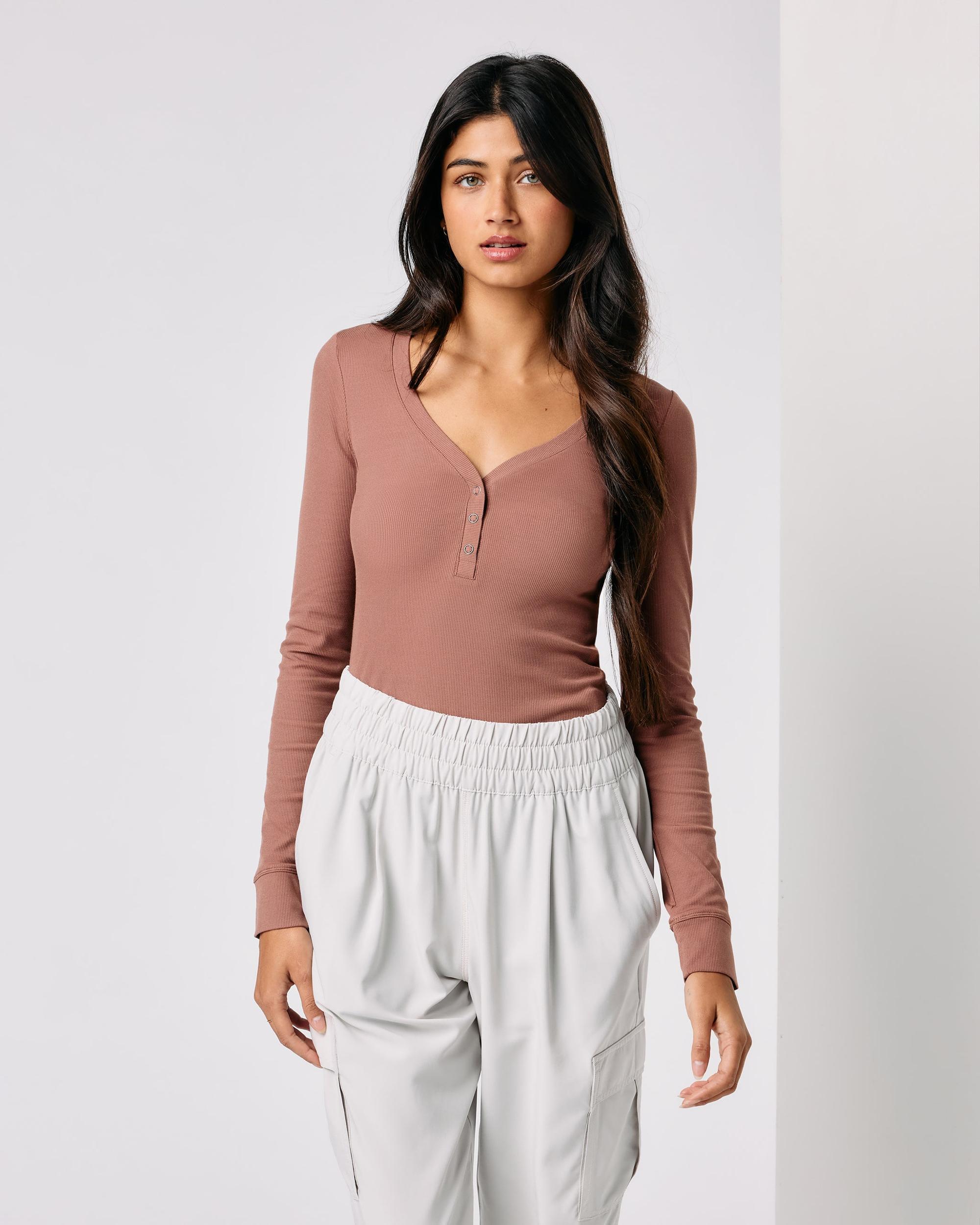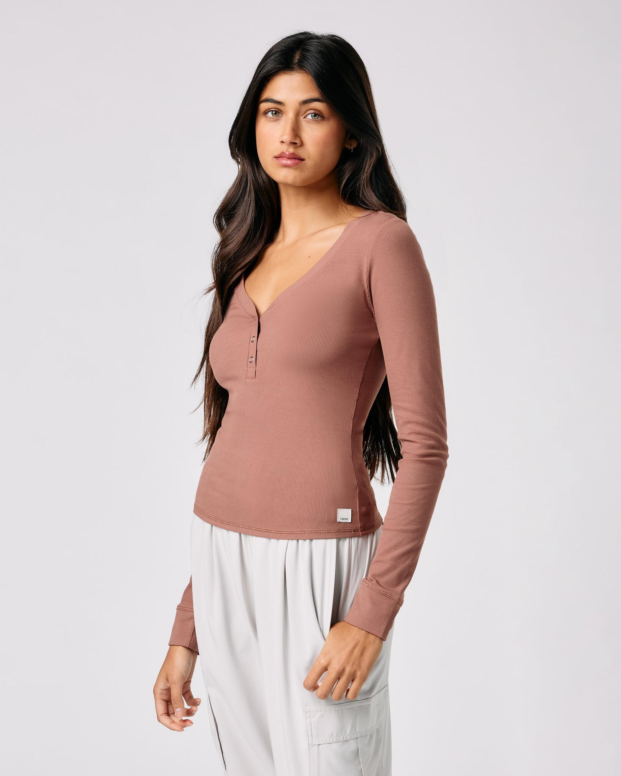The Long Sleeve Pose Henley in Terracotta is comfortable and easy-wearing with a form-hugging fit. Shop this flattering women's rib Henley from Vuori.