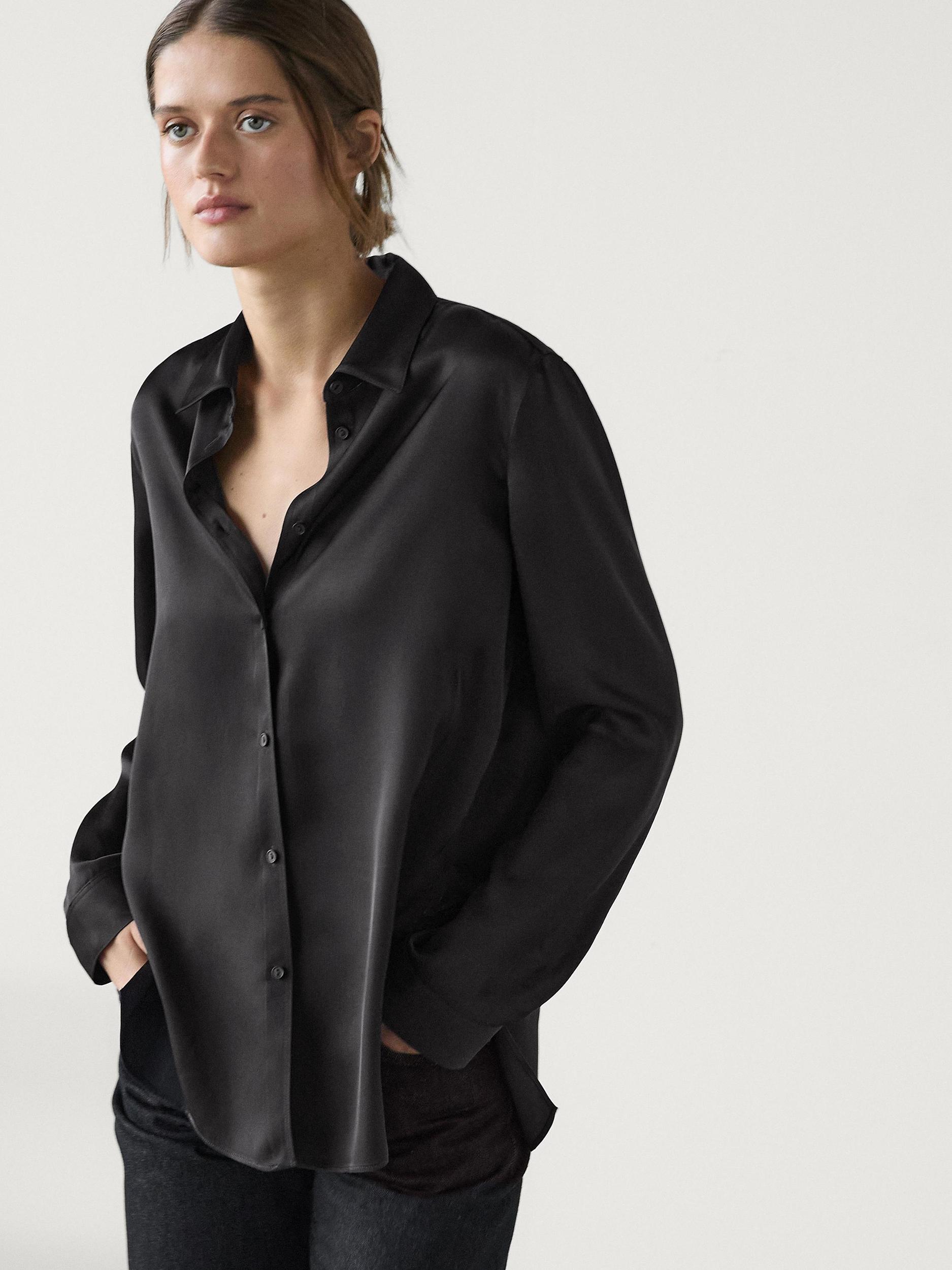 Shirt, Shirt collar, Long sleeves, Buttoned cuffs, Button-up front, Satin finish, This garment is longer than usual.