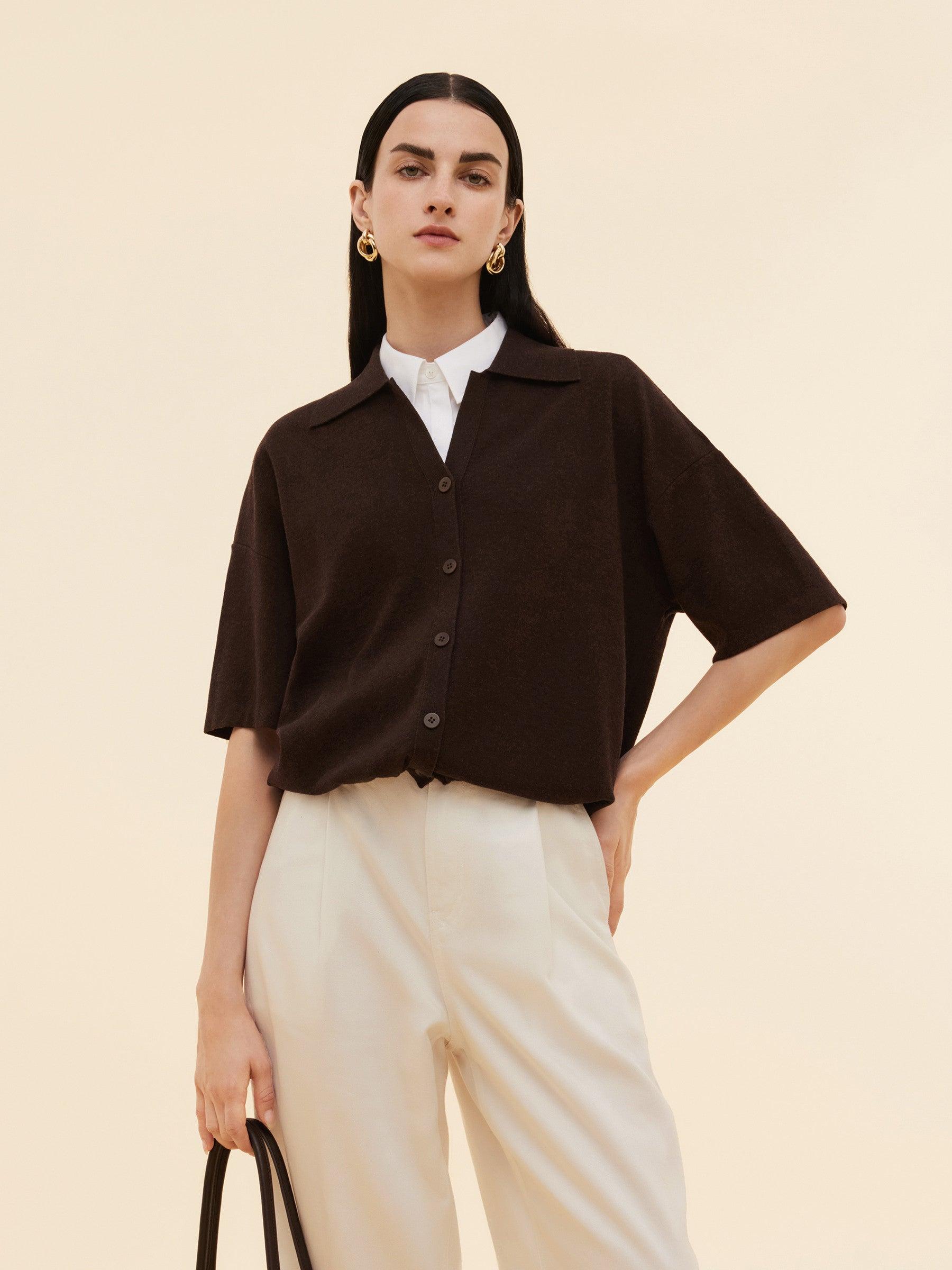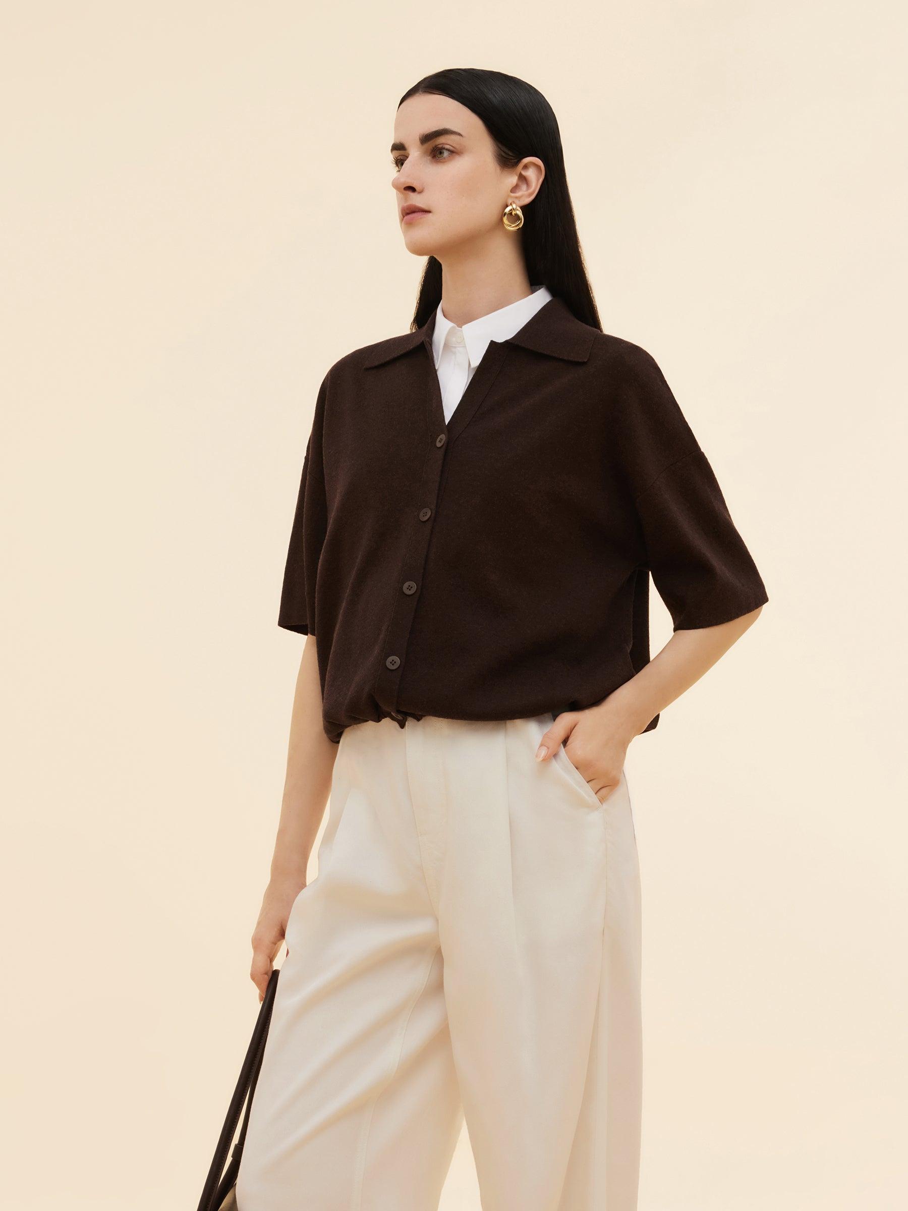 -Cotton blend -Loose fit -Machine washable Crafted from a cotton-blend knit with excellent stretch, this shirt cardigan offers a soft, breathable feel against the skin. The relaxed fit and collared open-front design allow for versatile styling, while the drawstring hem lets you adjust the length and silhouette for a mo