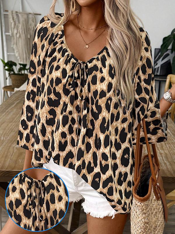 Loose Three-Quarter Sleeves Drawstring Leopard Printed V-Neck Blouses&Shirts Tops
