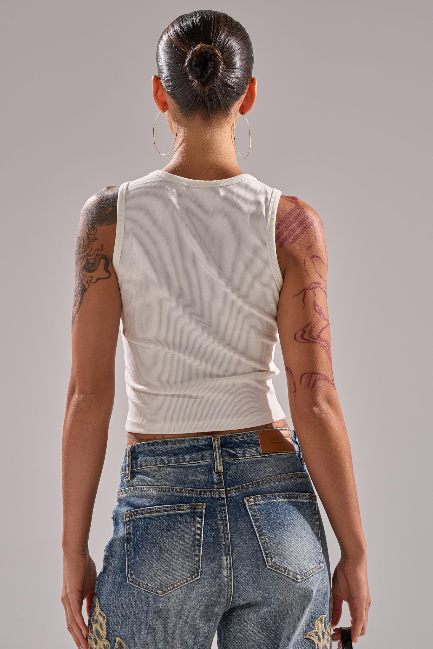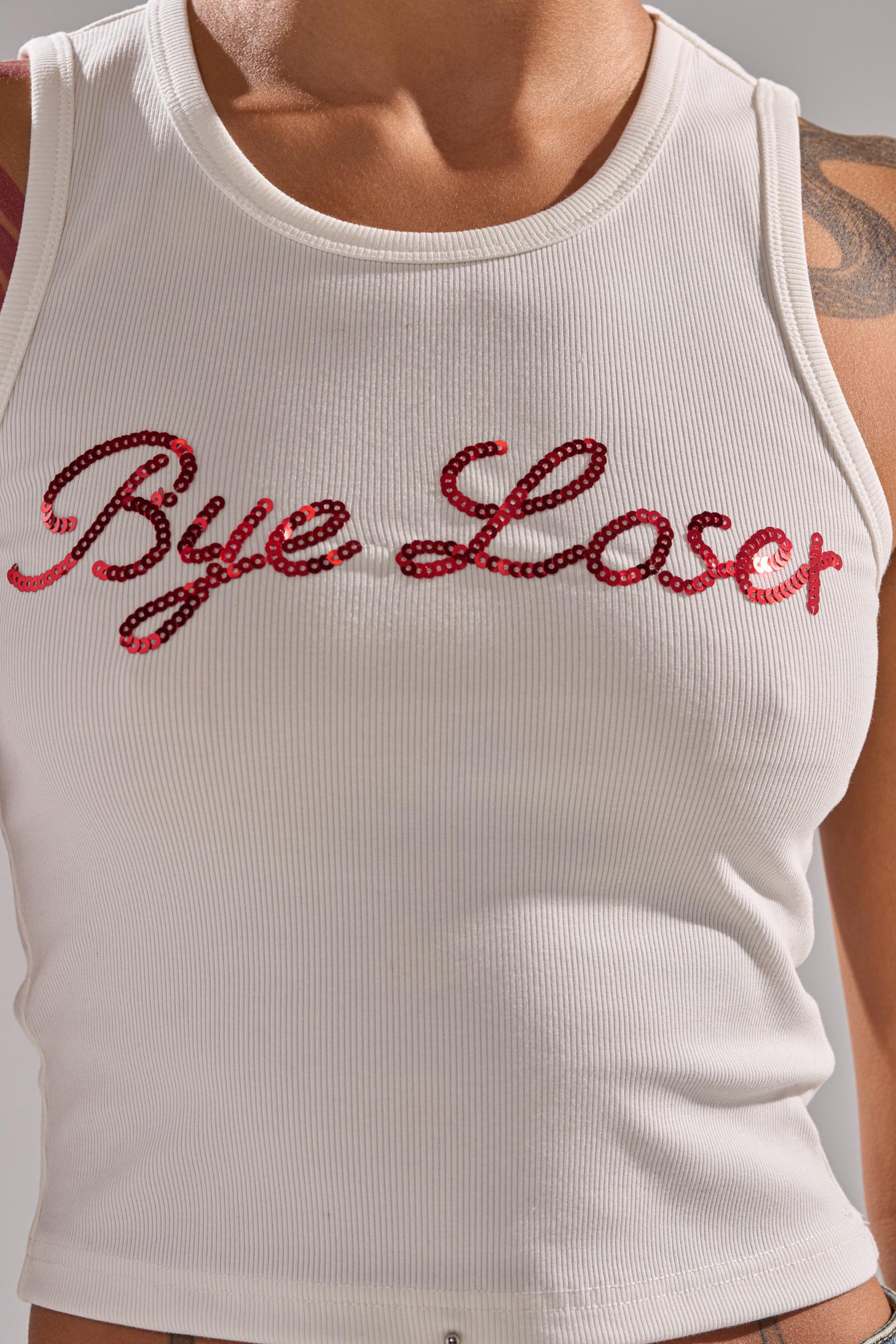 The AKIRA Label Loser Bye Tank is main feed material only. Crafted from a stretchy, ribbed knit material, this sassy top boasts a classic crew neckline, a sleeveless design, and the cursive phrase “Bye Loser” is spelled out across the chest in sparkling, red sequin embellishments. Pair with anything from micro skirts to boyfriend jeans for a cutthroat finish. - 50% Cotton 42% Rayon 8% Spandex- Spot Clean Only- Stretchy- Imported (all measurements approximate from size small)- 17” Shoulder to Hem- 10” Shoulder to Shoulder- Model is 5’7” and is wearing size smallProduct ID: 1073485 (all measurements approximate from size 1X)- 20” Shoulder to Hem- 13” Shoulder to ShoulderProduct ID: 1073489