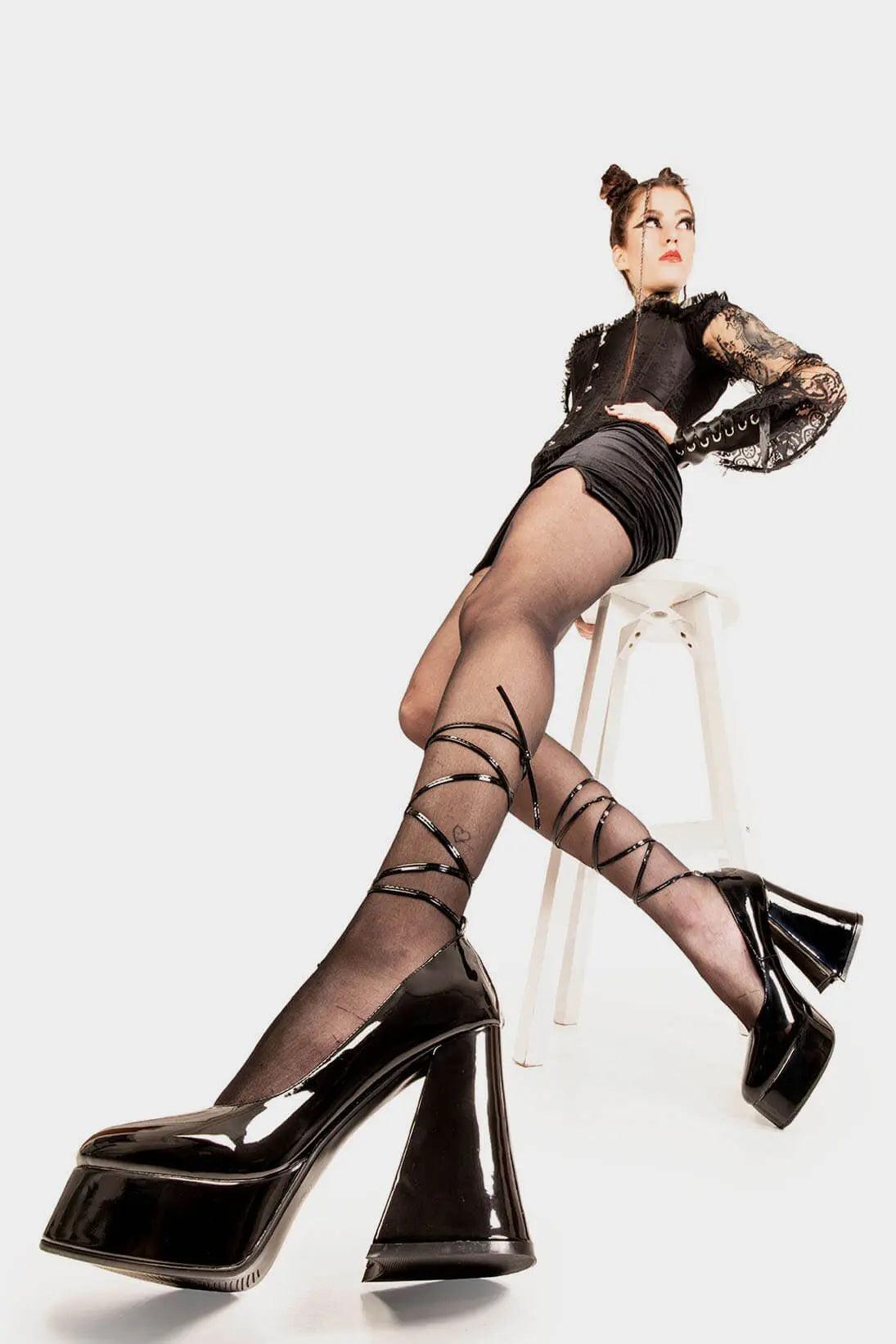 SELF LOVE CURES ALLLost Queen Platform Heels in Black Patent. These vegan Platform Heels feature a wrap around lace strap and a high Platform sole, perfect for adding height, style and glam to any outfit. Made with eco-friendly materials and 100% cruelty-free, these Heels are as ethical as they are cute! - Platform Height: 2.6 inch- Heel Height: 5.5 inch- Red Heart- Lace wrap around strap - High platform sole- Flaired Heel- Round toe - 100% vegan SKU: LMC 266 - BlackPAT