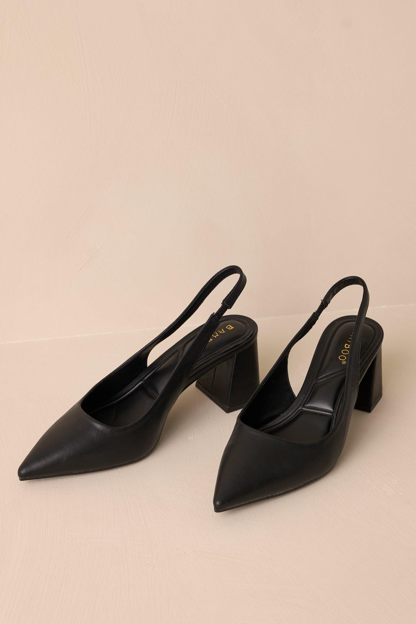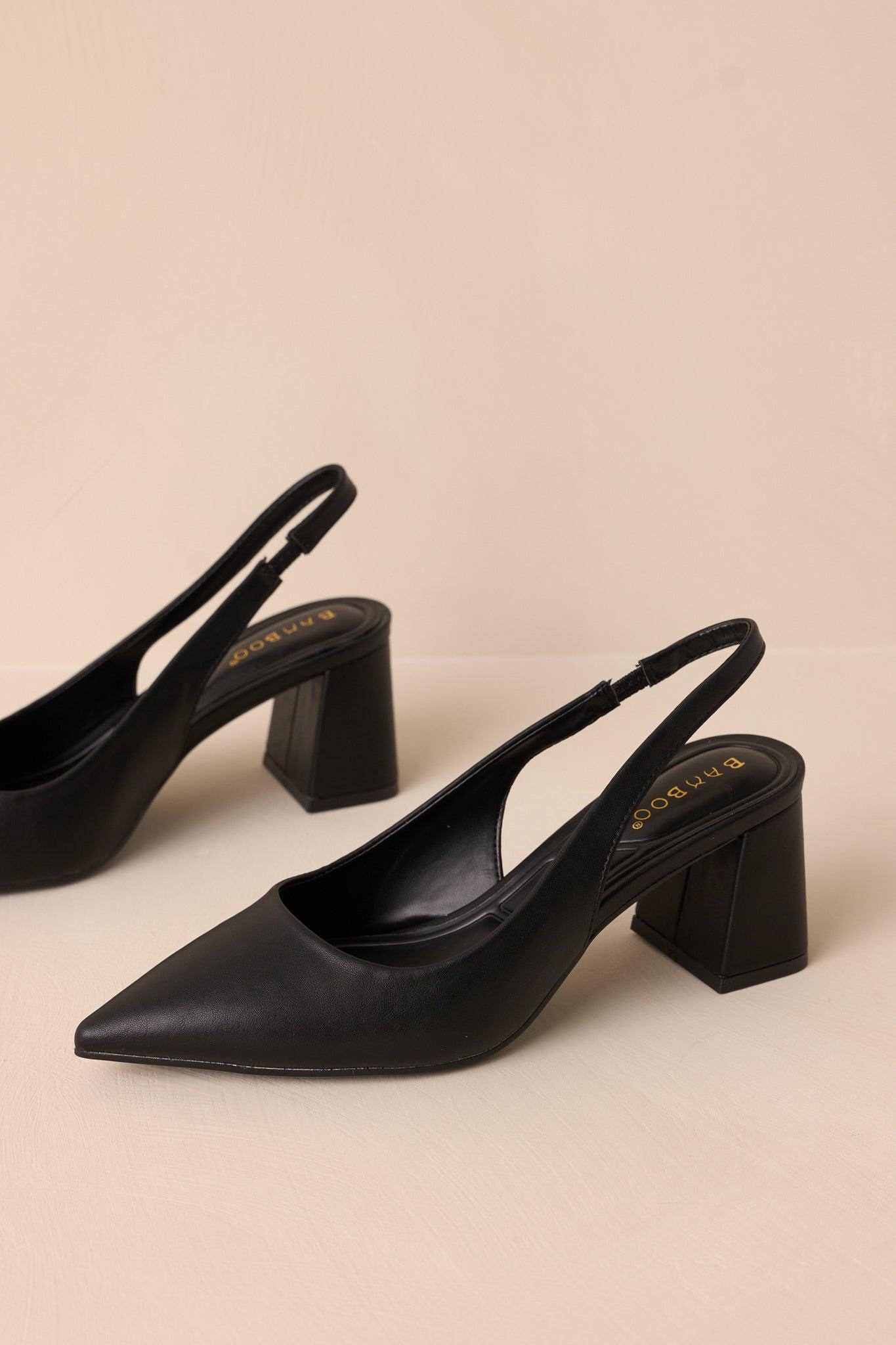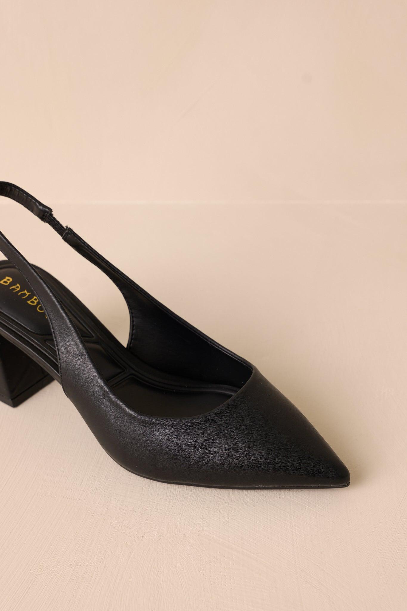 Step into style with the Lost Your Chance Black Pointed-Toe Slingback Heels. These stunning heels feature a classic pointed-toe design and a playful slingback strap, perfect for any occasion. You won't want to miss your chance to own these must-have heels! These black heels feature a pointed toe, a faux leather material, a strap around the back of the foot, and a thick block heel. Heels measures 2" All Man Made Materials Non-skid Sole Manufactured in China Designed in the USA True to Size