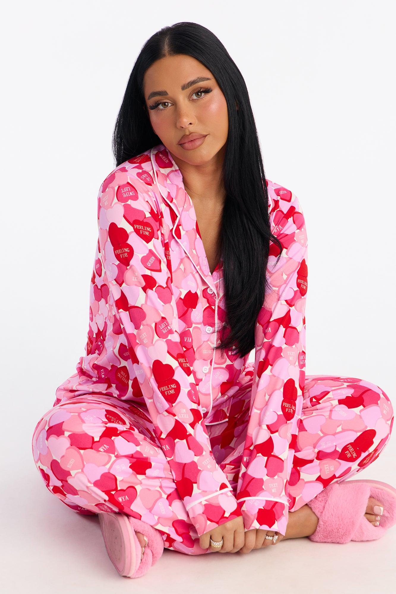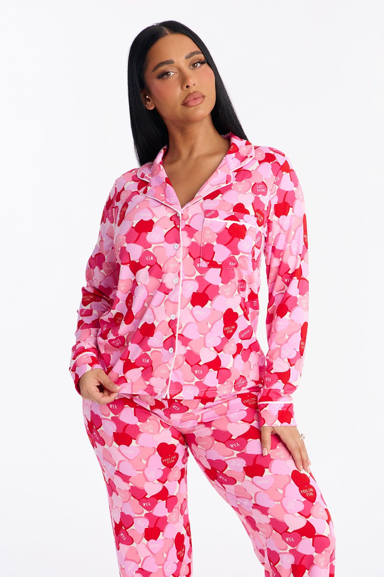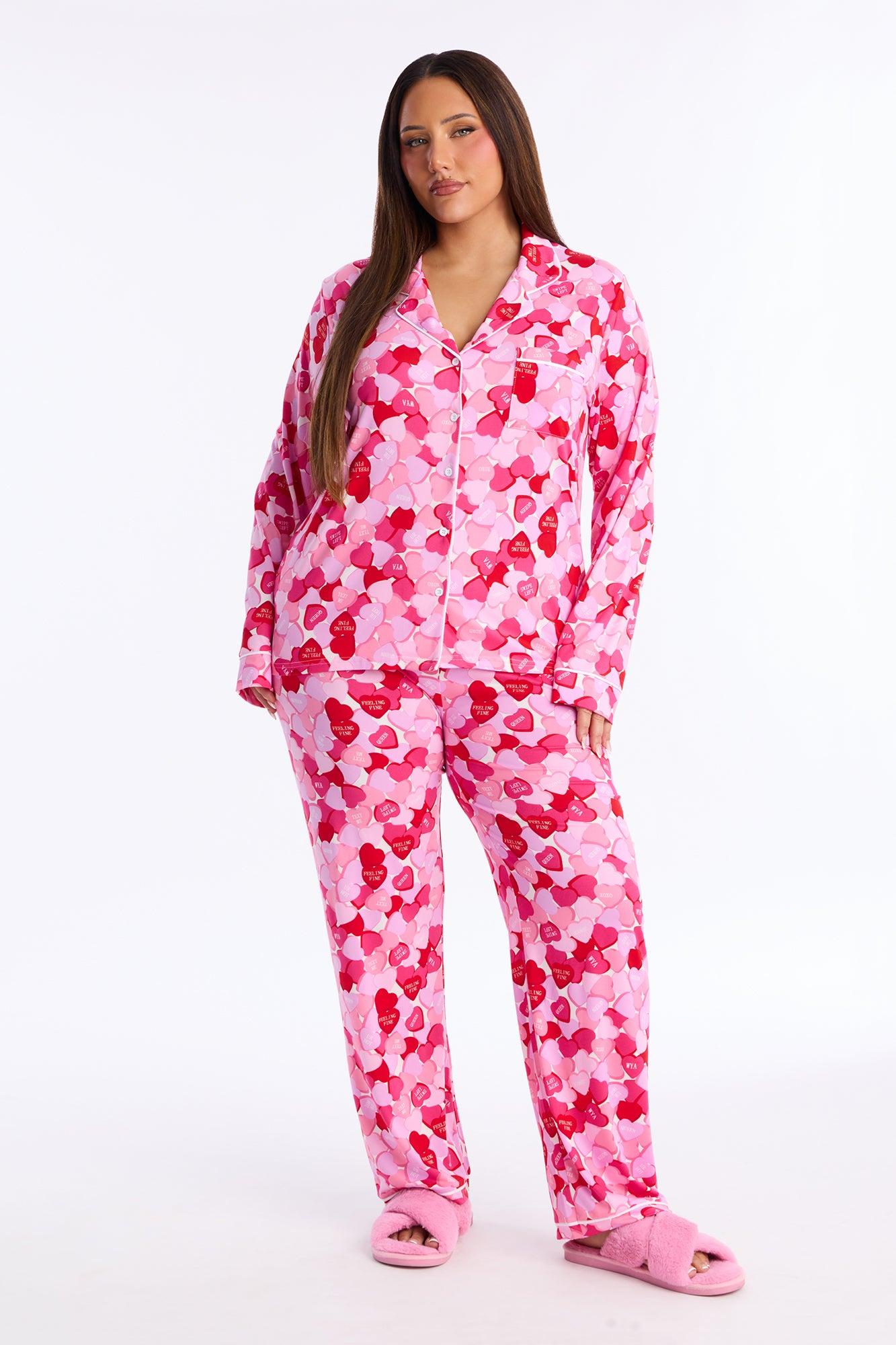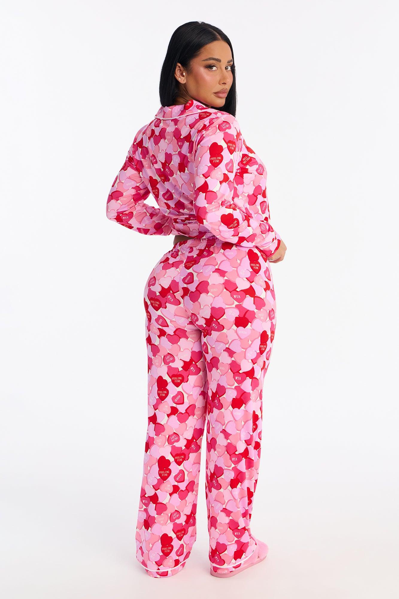 Available In Pink/combo. PJ Pant Set Long Sleeve Button Up Shirt Chest Pocket Collar Matching Pant Elastic Waistband Stretch Candy Heart Print Final Sale Self : 95% Polyester 5% Spandex Imported