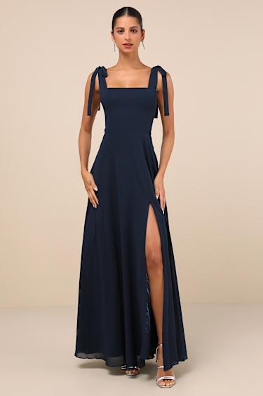 Let the Lulus Love Me Forever Navy Blue Tie-Strap Square Neck Maxi Dress take you on a romantic night out! Woven chiffon shapes this chic dress that has wide straps that tie together at the shoulders, supporting a square neckline. The princess-seamed bodice tops a flowy maxi skirt with a thigh-high slit at the front. Hidden back zipper/clasp.