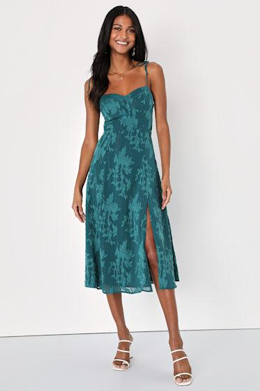 Tied and TrueThis floral jacquard dress catches the light with silver Lurex threading and falls effortlessly from tying shoulder straps into a bustier-style bodice with a sweetheart neckline. An A-line midi skirt features a side slit for graceful movement. Smocking and hidden zipper/clasp at back.