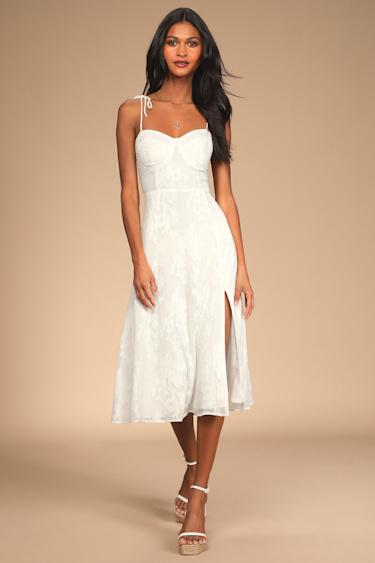 Arrive looking like the guest of honor in the Lulus Loveliest Looks White Floral Jacquard Tie-Strap Midi Dress! Woven jacquard fabric, with metallic gold threading and a floral design, shapes this dress that has tying straps and a sweetheart neckline. Bustier-style seaming accents the bodice atop a midi skirt with a front slit. Smocking at back for fit. Hidden side zipper/clasp.