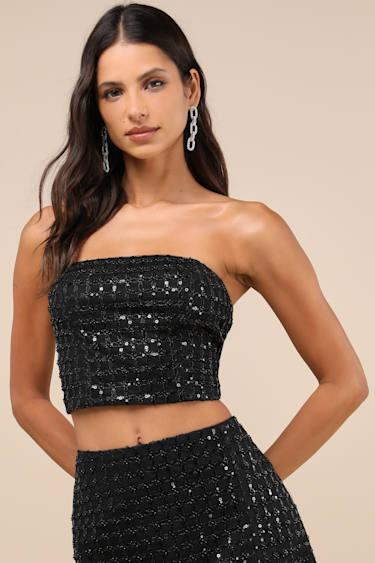 You'll reach for the Lulus Lovely Decadence Black Sequin Beaded Strapless Crop Top any time the evening calls for a statement-making look! This stunning lil' top has a sheer mesh overlay, adorned with a dazzling pattern of sequins and beaded accents, that shapes a strapless bodice and a straight neckline with hidden no-slip strips. The ultra-cropped hem lends an extra flirty finish. Exposed silver zipper/clasp at the back. Pair with the matching skirt for a complete look!