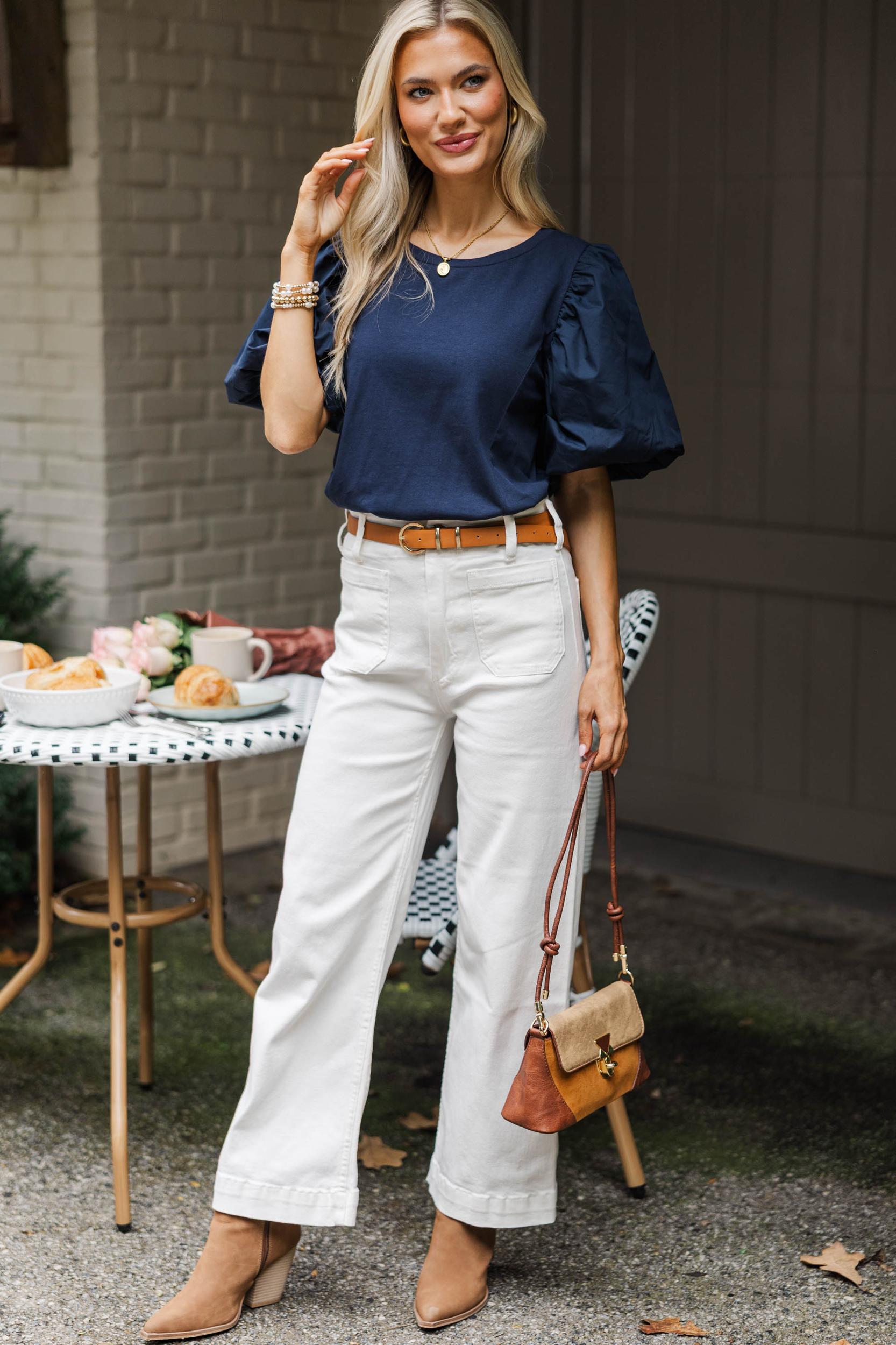 Delight in the perfect morning-to-night blouse! This Lovely New Day Blouse is made from breathable cotton fabric and features short puff sleeves and a classic fit. Enjoy comfort and effortless style with chic blouse! Round neckline Short bubble sleeves No stretch Baileigh is wearing the small.