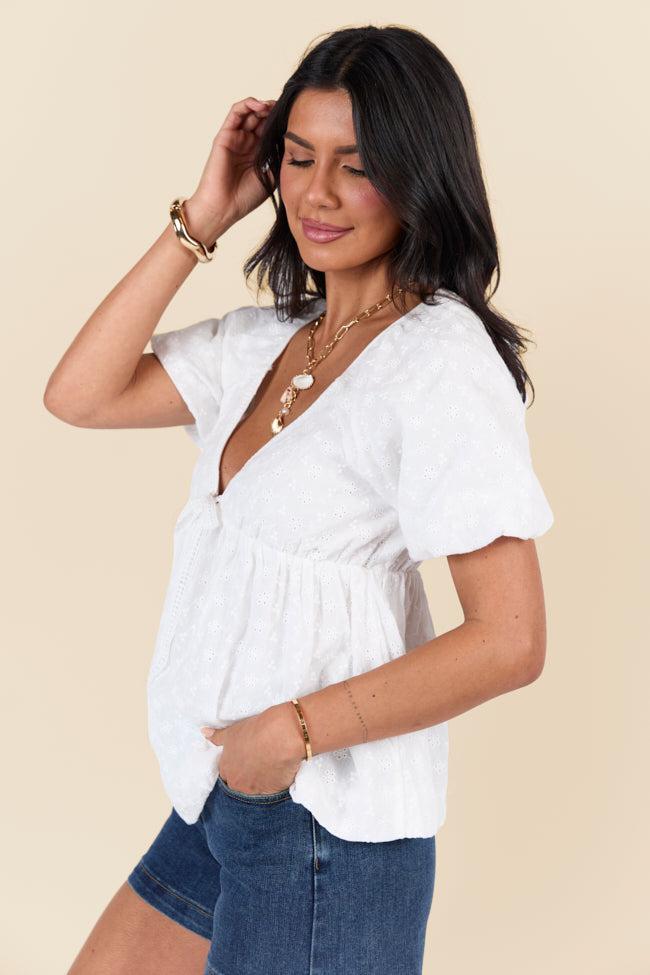 Details Ivory Embroidered Floral Bubble Hem Blouse Fabric only has stretch in elastic Bubble sleeves, V-neckline with decorative bow, bubble hem Lined Size small from shoulder to hem: 22" Material and Care Shell: 100% polyester, lining: 95% Polyester 5% elastane Machine wash cold, no drum drying Patterns may vary Materials may have natural variations Colors may vary from different viewing devices.
