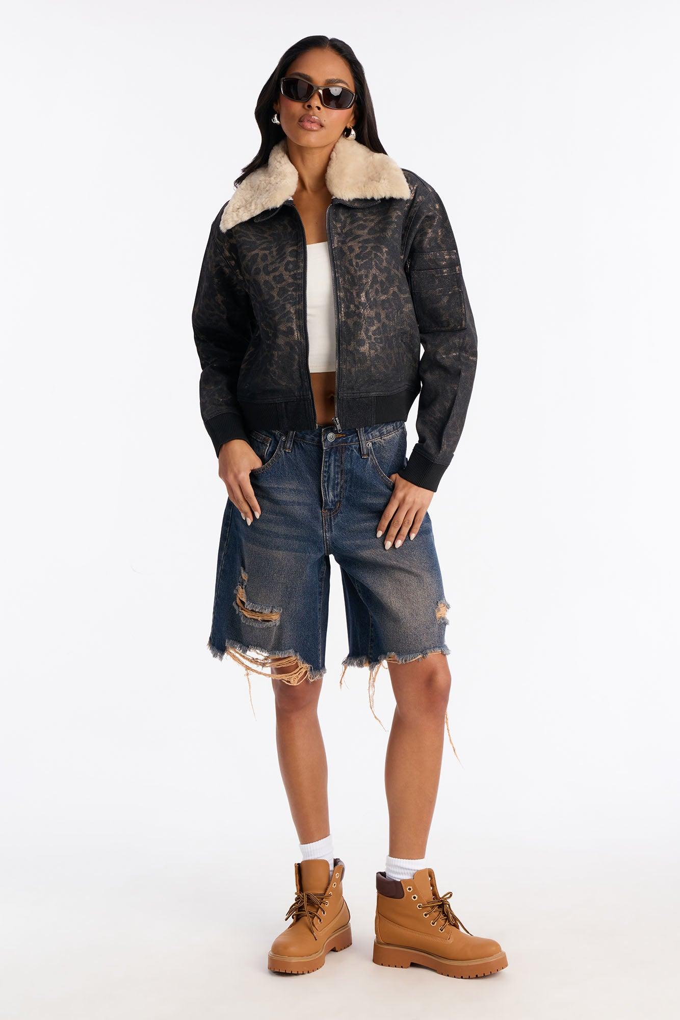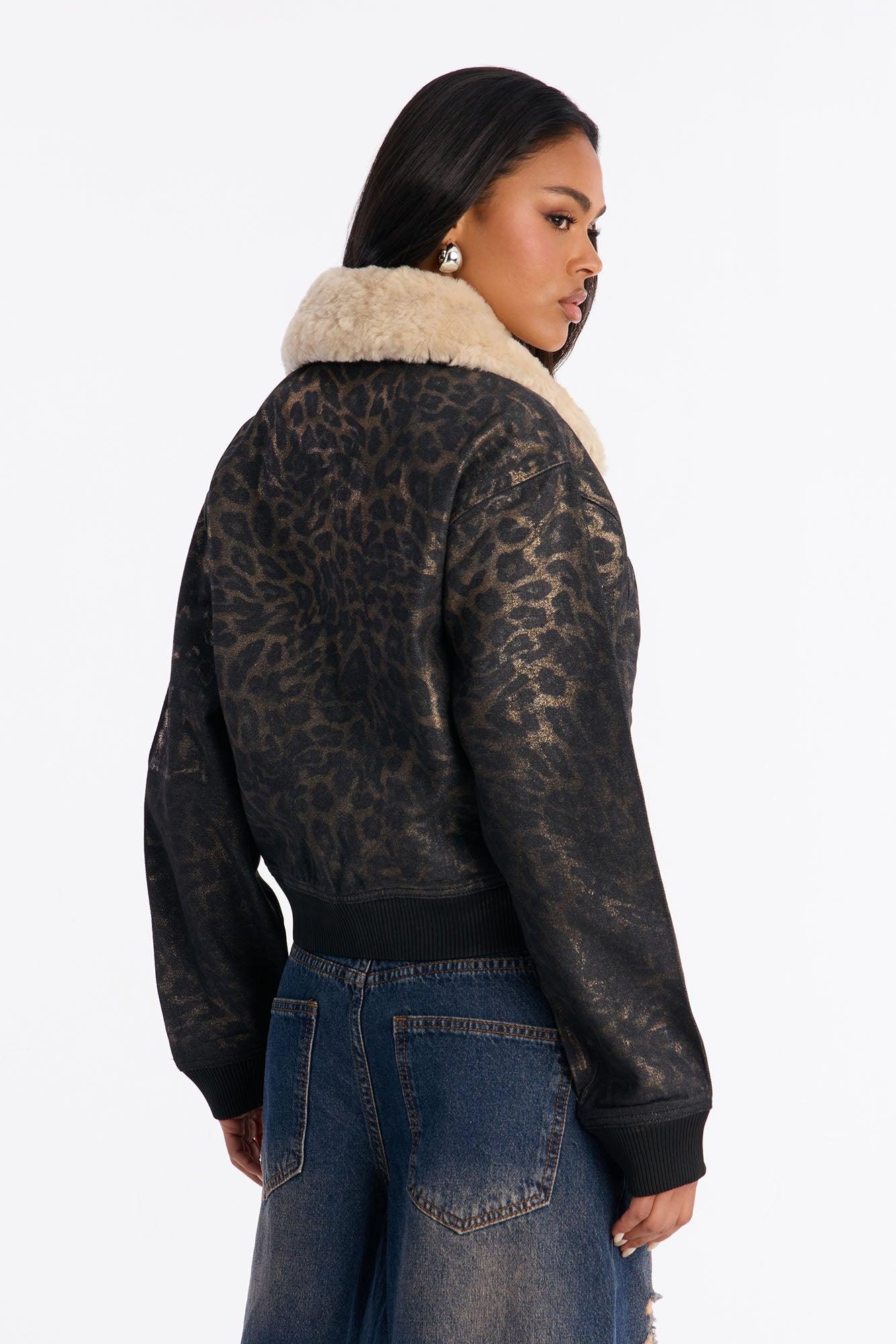 Available In Black/combo. Denim Bomber Jacket Foil Animal Print Zipper Closure Faux Fur Collar Front Pockets Non Stretch Disclaimer: Print Placement Will Vary. Self: 58% Cotton 24% Rayon 18% Polyester Faux Fur: 100% Polyester Imported California Proposition 65WARNING: Cancer and Reproductive Harm - www.P65Warnings.ca.gov.
