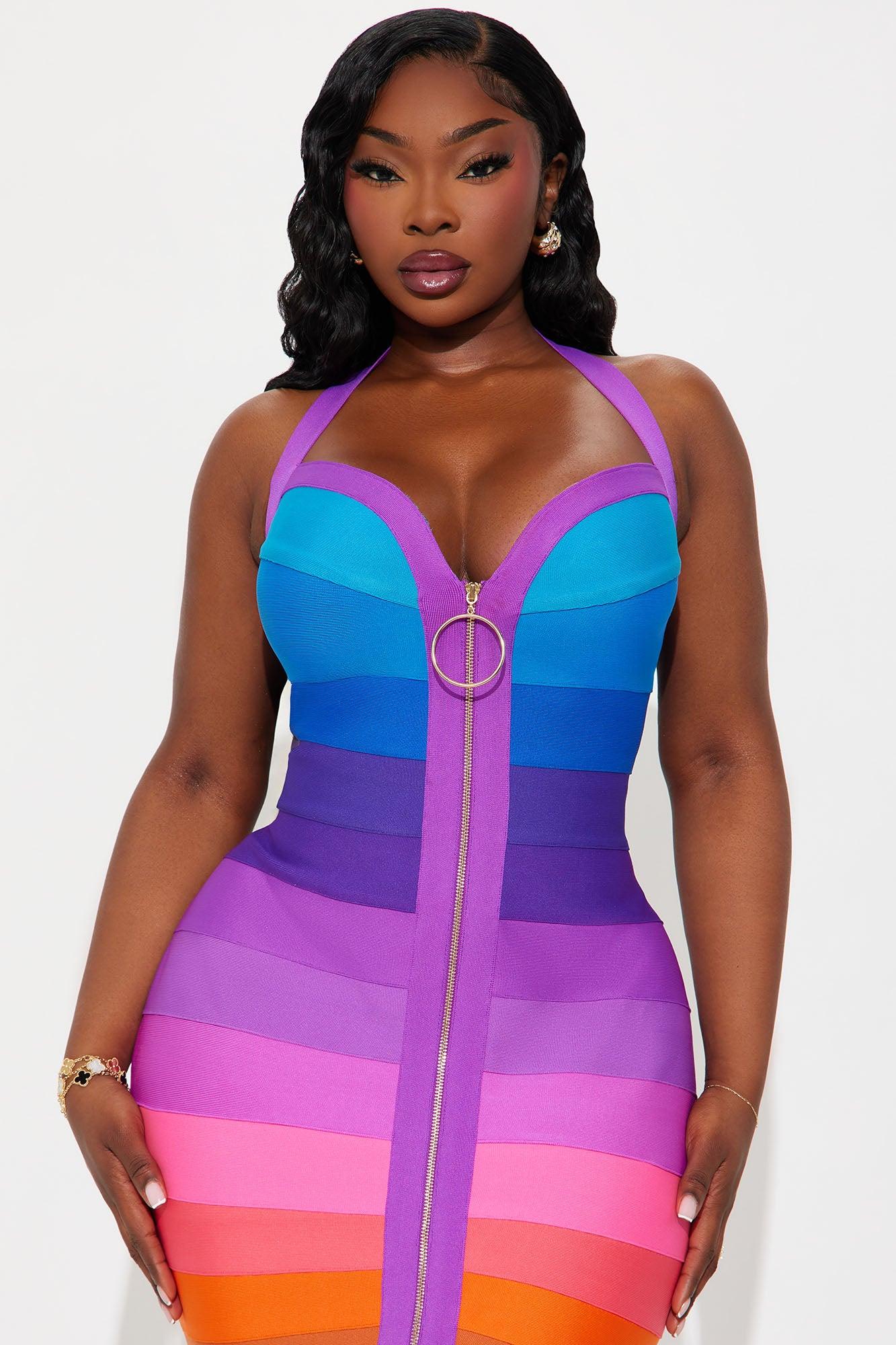 Available In Purple/combo. Bandage Midi Dress Sweetheart Neckline Halter Zip Front Stripes Open Back Zip Back Stretch Length Measured Flat = 35" 90% Polyester 10% Spandex Imported California Proposition 65WARNING: Cancer and Reproductive Harm - www.P65Warnings.ca.gov.
