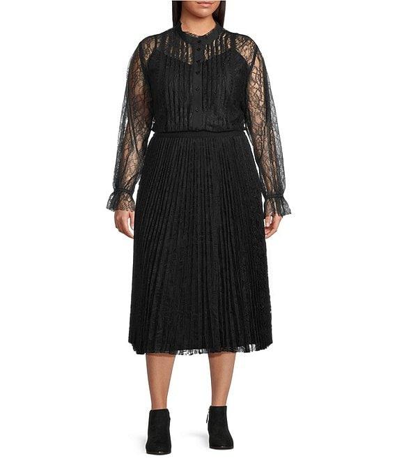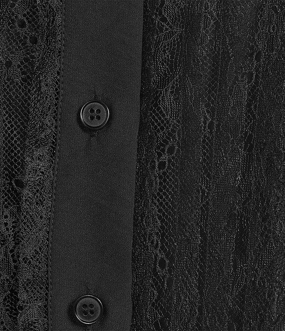From Lucy Paris Plus, this top features: Lace knit fabrication Blouse silhouette Mock neckline Long sleeves with ruffle cuffs Ruffle detail Fitted fit Fully lined Straight hemline Button front closure Approx. 25" length Nylon; lining: rayon/nylon/polyester Machine wash Imported.