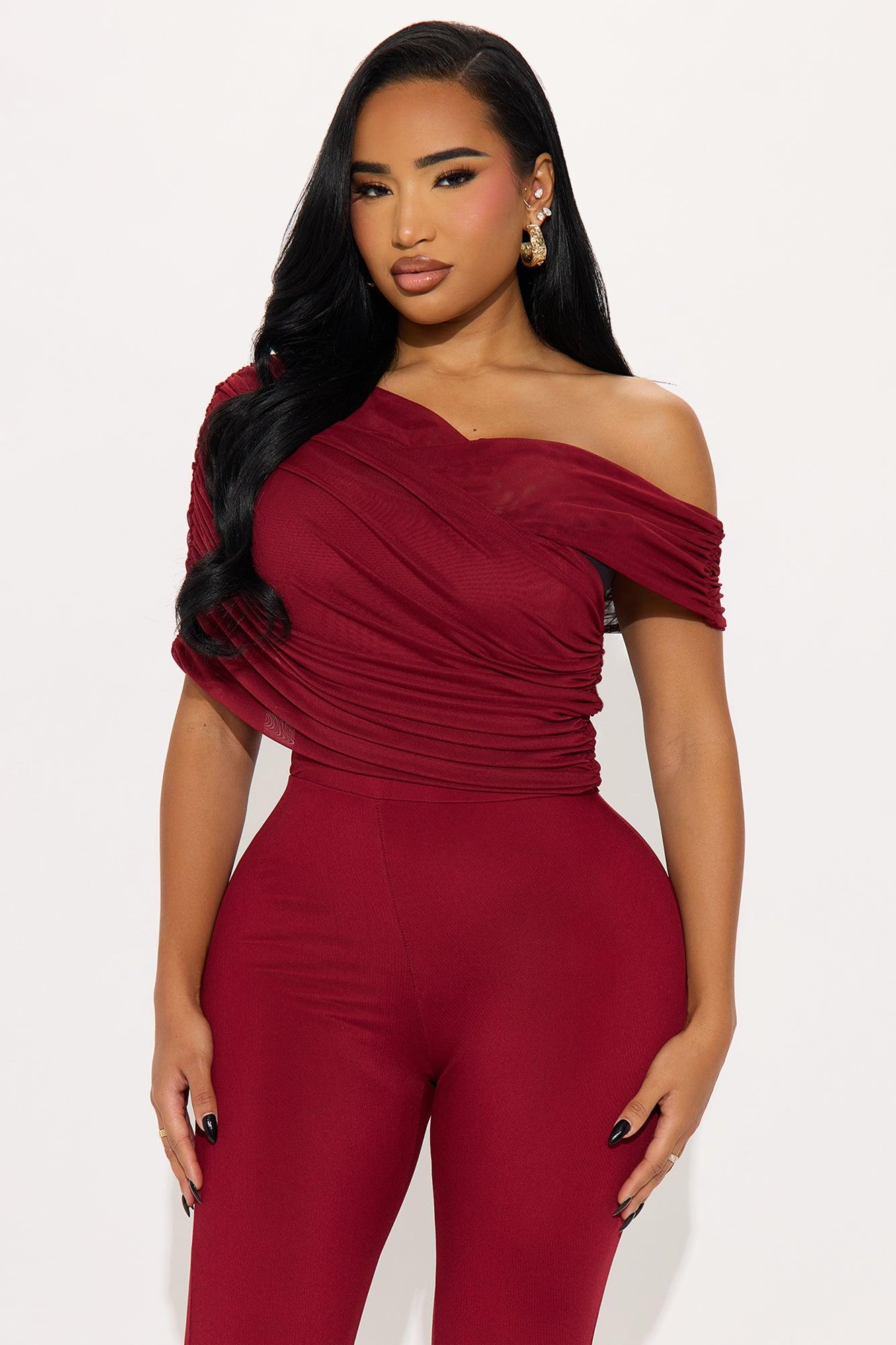 Lucy Ruched Mesh Off Shoulder Jumpsuit - Burgundy Female