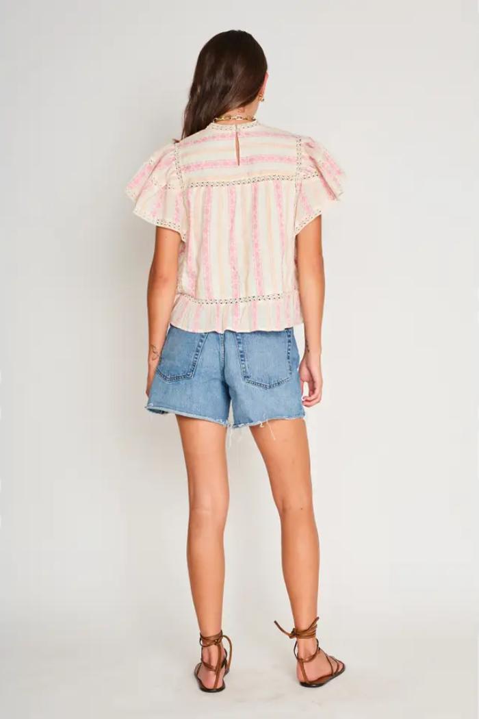Elevate your everyday style with the Lulu Top, a perfect blend of vintage charm and modern elegance. Designed with delicate lace trim, soft flutter sleeves, and intricate detailing, this top adds a touch of effortless romance to any outfit. The relaxed fit and lightweight fabric ensure all-day comfort, making it ideal for both casual outings and dressier occasions. Pair it with denim shorts for a laid-back look or tuck it into high-waisted trousers for a polished ensemble.