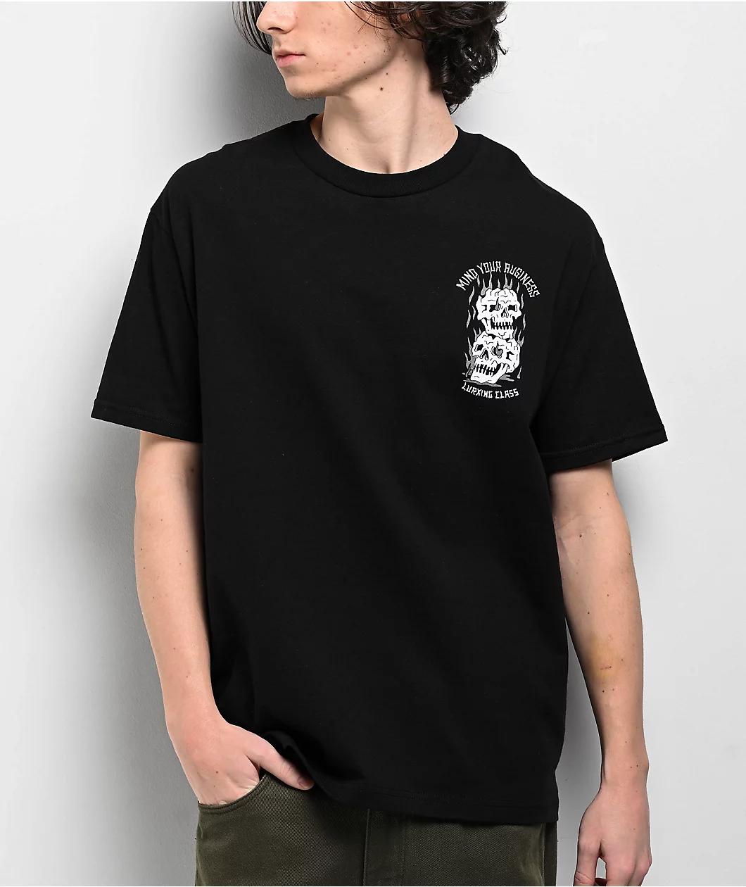 Inspired by dark imagery, the Mind Your Business t-shirt from Lurking Class by Sketchy Tank features reflective 3M printed graphics for a flashy, noticeable accent. Boasting two flaming skulls on the left chest with branding, the back of the short sl