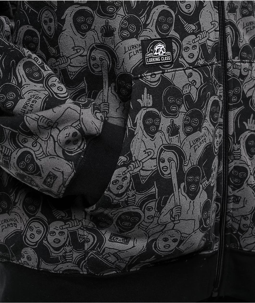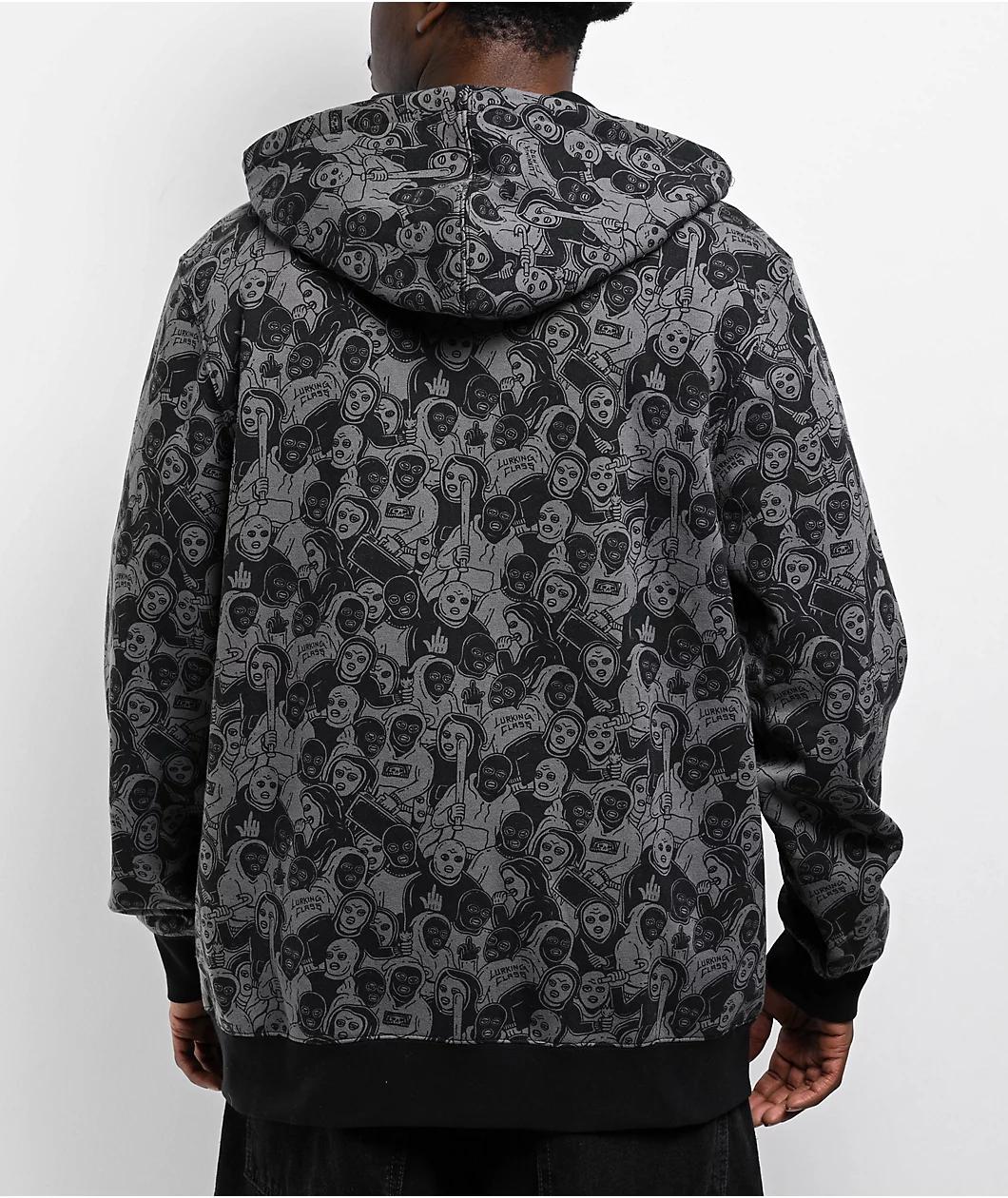 Embrace an urban streetwear look with the grey and black Mob zip hoodie from Lurking Class by Sketchy Tank. A printed graphic throughout depicts countless masked goons armed with baseball bats and middle fingers for an intimidating vibe. The custom c