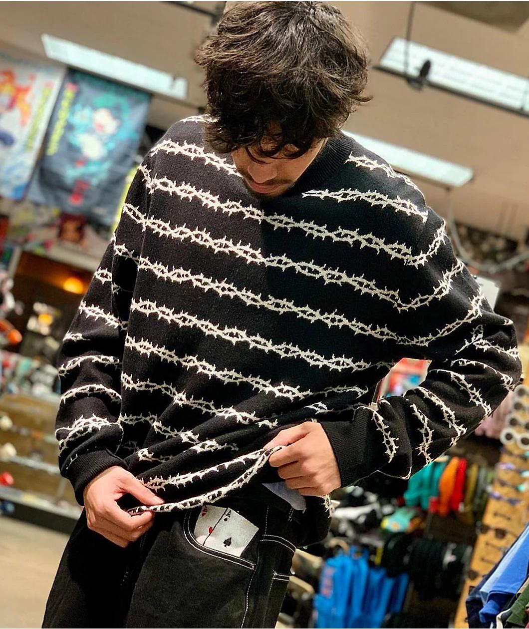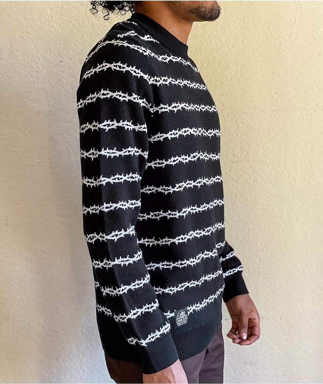 Bundle up in Lurking Class style with the Thorns black sweater from Lurking Class by Sketchy Tank. This soft knit crew neck sweater comes in black and features white thorned stripes horizontally throughout. Finished with a woven Lurking Class label at the
