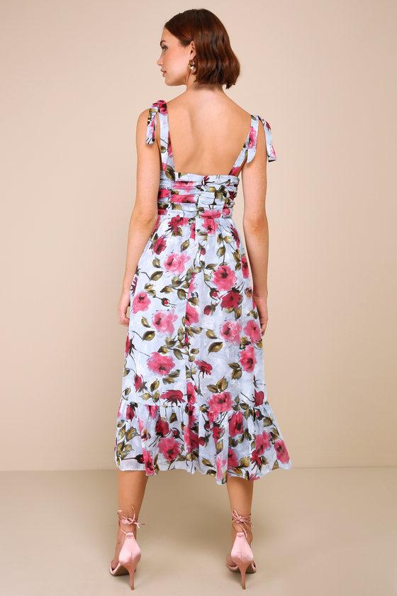 We're loving the crush-worthy vibes of the Lulus Lush Loveliness Light Blue Floral Jacquard Tie-Strap Midi Dress! Airy woven chiffon, with a romantic floral print and burnout design throughout, shapes tying shoulder straps that support a gathered bodice with a notched V-neckline and decorative buttons. High, fitted waist falls to an A-line skirt that ends at a flouncy, midi hem. Hidden back zipper/clasp.