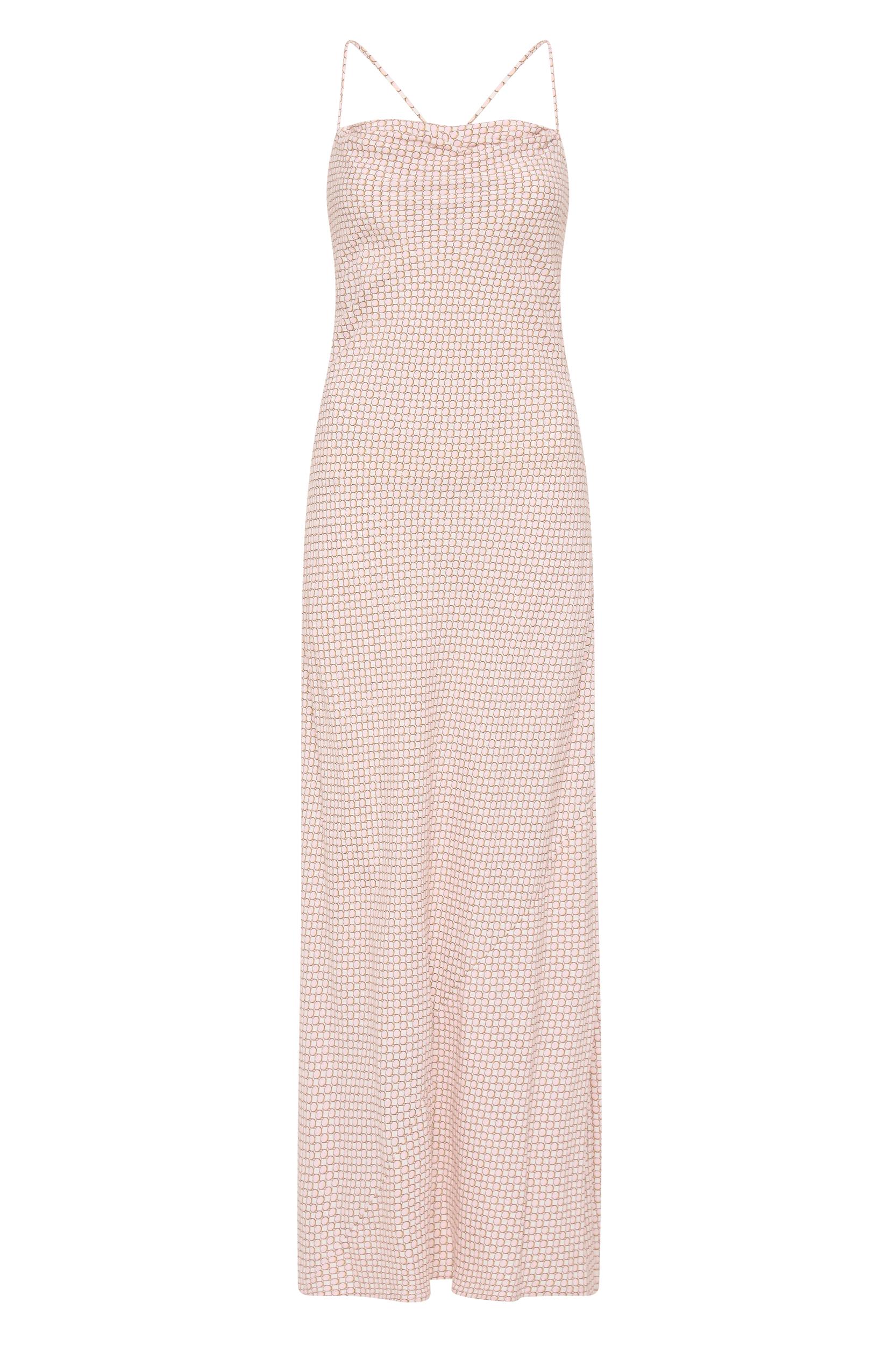 A rayon crepe maxi dress with thin adjustable straps and a cowl neckline. Fitted through the bodice, it features a shirred back for additional stretch and a semi-relaxed skirt that falls around the ankles. Printed in a micro baby pink floral motif, it is designed for summer holiday dressing.