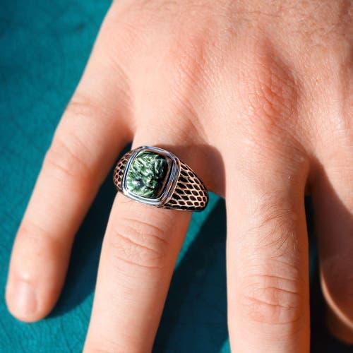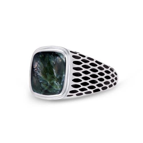 Crafted in 925 Sterling Silver, this ring features a Seraphinite stone with an intricate honeycomb-inspired precious metal design on the ring shank in Black Rhodium. Seraphinite is a deep evergreen color stone laced with glimmering patches of silver that reflect light at different viewing angles.