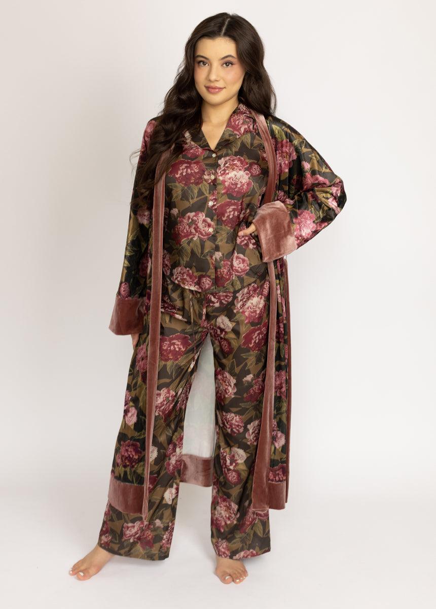 Indulge in luxury with our Lyana PJ Set, designed for women who appreciate style and comfort. This pajama set features a stunning custom print on silky satin fabric, ensuring a soft, smooth feel against your skin. For a complete, coordinated look, pair it with our matching Kamila Robe, creating the ultimate in chic, cozy elegance. Top & bottom set High waisted bottoms Functional waist tie Long sleeve top Button front 100% Polyester Hand wash only, line dry Model is 5'5 wearing an XS