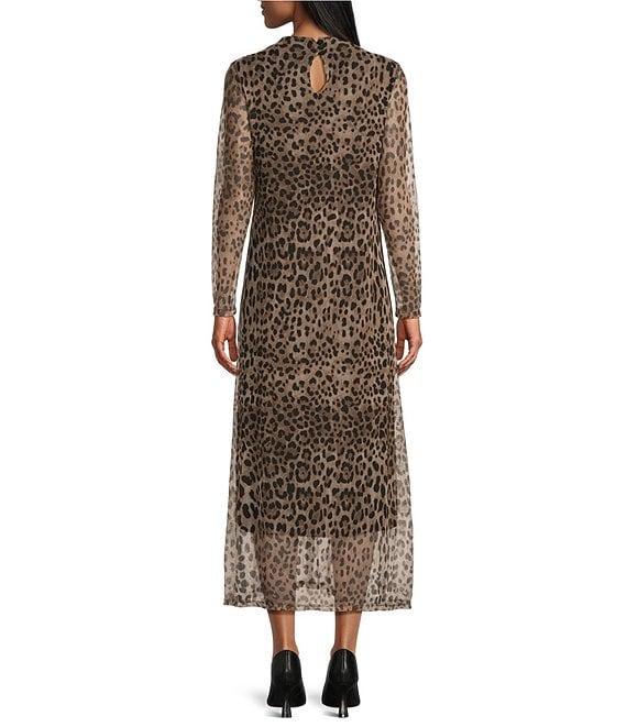 M Made in Italy Leopard Mesh Mock Neck Long Sleeve A-Line Maxi Dress