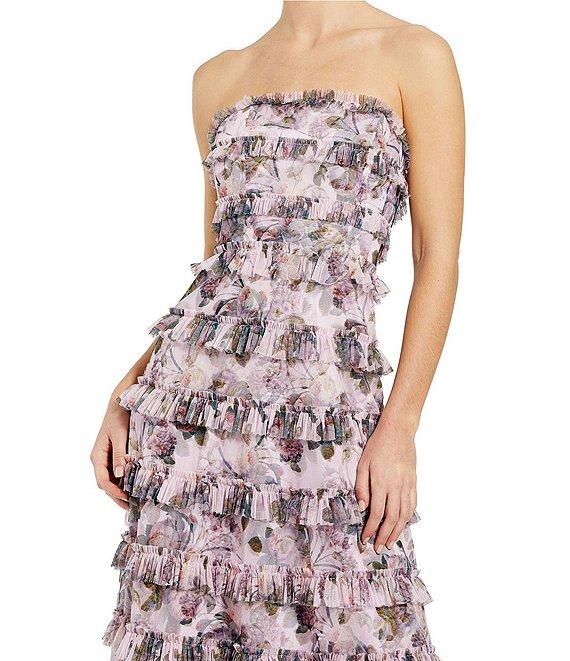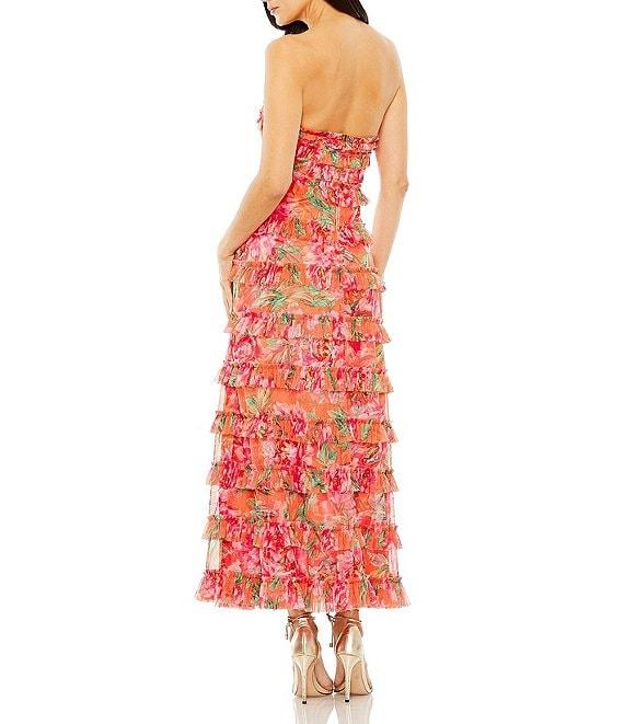 Mac Duggal Chiffon Floral Print Strapless Neck Sleeveless Ruffle Tiered A-Line Maxi Dress