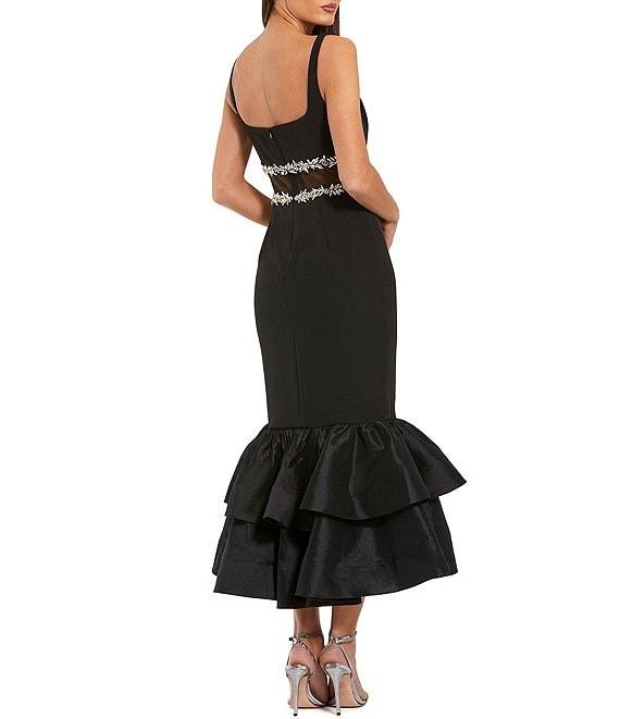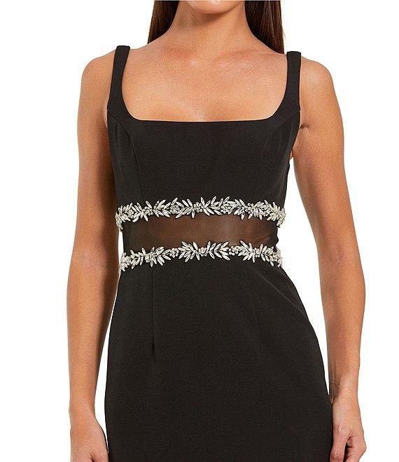 From Mac Duggal, this dress features: Crepe fabrication Column gown silhouette Square neckline Sleeveless Ruffle hem Beaded belt detail Sheer belt detail Zip back closure Approx. 48" length Polyester Hand wash cold Imported.