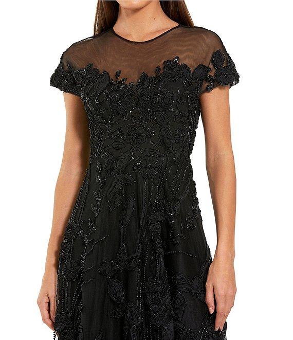 From Mac Duggal, this dress features: Lace and mesh fabrication A line silhouette Crew neckline Short sleeves Embellished lace Illusion neck Zip back closure Approx. 54" length Polyester Hand wash Imported.