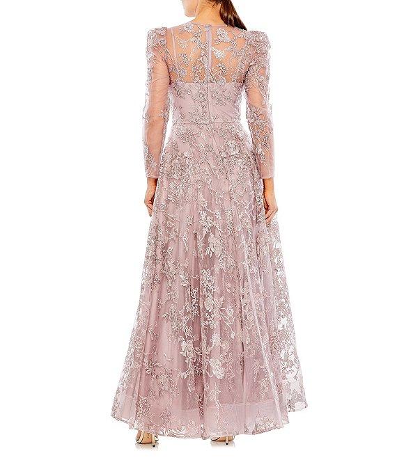 From Mac Duggal, this dress features: Embroidered fabrication A-line silhouette Illusion crew neckline Long illusion sleeves Embroidered sequin detail Zip back closure Approx. 60" length Polyester Hand wash cold Imported.