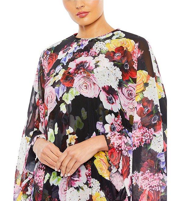 From Mac Duggal, this dress features: Round neckline long sleeves cape back fully lined ruffle trim floral print center zip back closure approx. 32.5" length from shoulder to hem polyester spot clean imported.
