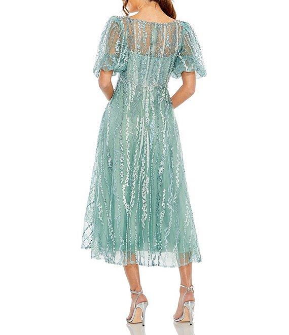 Mac Duggal Illusion High Crew Neck Short Puff Sleeve Embellished A-Line Midi Dress