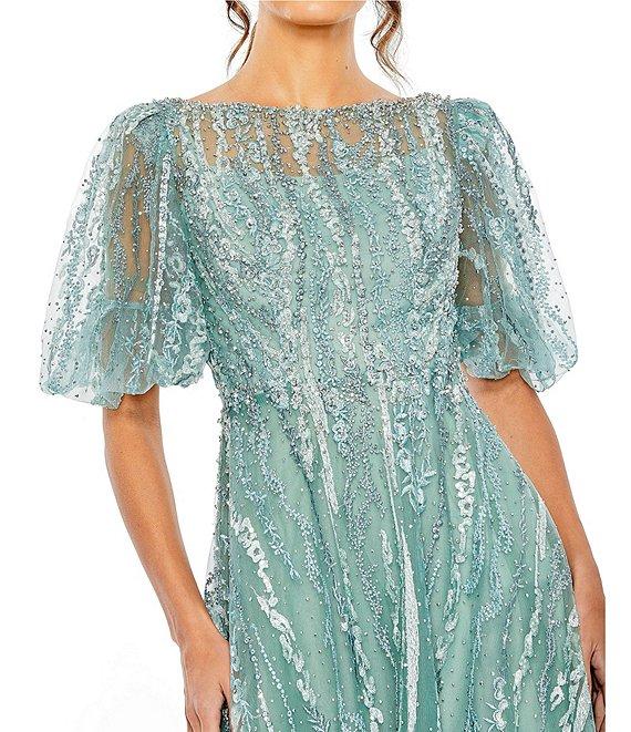 From Mac Duggal, this dress features: Beaded mesh fabrication A line silhouette Illusion crew neckline Illusion short puff sleeves Embellished Fully lined Zip back closure Approx. 45" length Polyester Dry clean Imported.