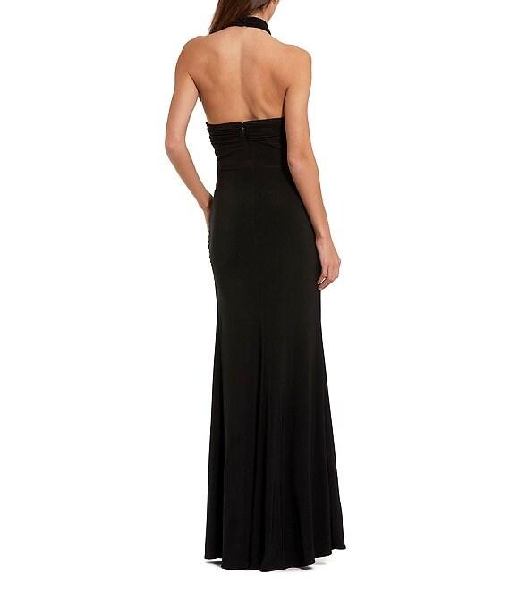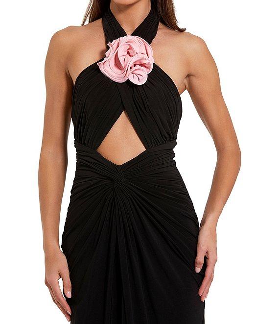 Mac Duggal, this dress features: Jersey fabrication Sheath silhouette Halter neckline Sleeveless 3D flower applique Open front Zip back closure Approx. 60" length Polyester Hand wash cold Imported.