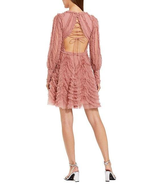From Mac Duggal, this dress features: Mesh fabrication A line silhouette Crew neckline Long sleeves Micro ruffle trim Lace up open back Zip back closure Approx. 45" length Polyester Hand wash cold Imported.