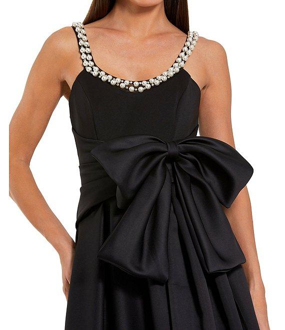 From Mac Duggal Petite, this dress features: Satin fabrication A-line silhouette Sleeveless Scoop neckline with pearl trim Bow detail at waist Box pleated skirt Front slit Zip back closure Lined Approx. 57" length Polyester Spot clean Imported.
