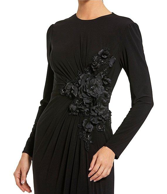 From Mac Duggal, this gown features: Jersey Fabrication Sheath Silhouette Crew Neckline Long Sleeves Beaded Floral Applique on Side Concealed Back Zipper Fully Lined Approx. 60" Length Polyester Hand Wash Cold / Lay Flat To Dry Imported.
