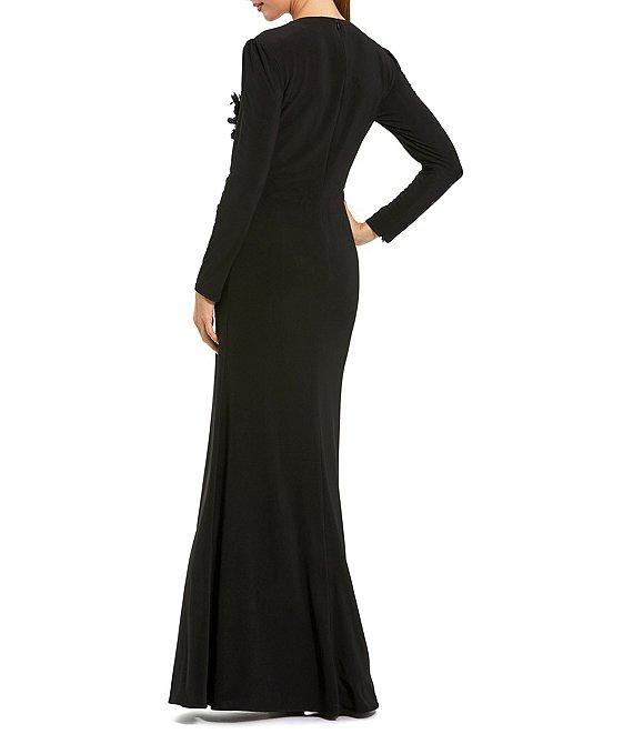 Mac Duggal Round Neck Long Sleeve 3D Floral Beaded Jersey Gown