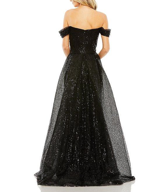 From Mac Duggal, this dress features: Sequin fabrication Off the shoulder neckline Cap sleevesTrain detail Zip back closure Fully lined Approx. 60" length Polyester Spot clean Imported.