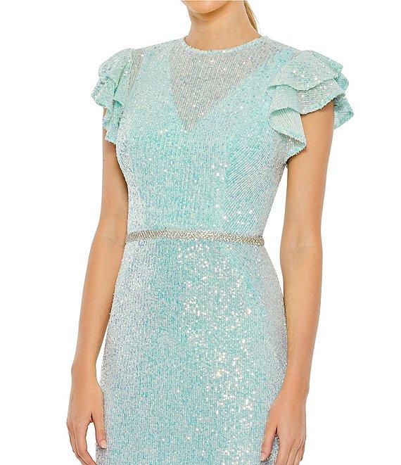 From Mac Duggal, this gown features:Sequined mesh fabricationMermaid silhouetteV-neckline with illusion high neck overlayShort ruffle flutter sleevesBeaded waistFully linedFlutter hemlineCenter back zip closureApprox. 60" lengthPolyesterHand washImported.