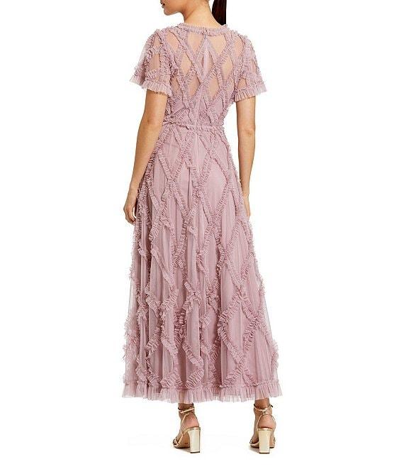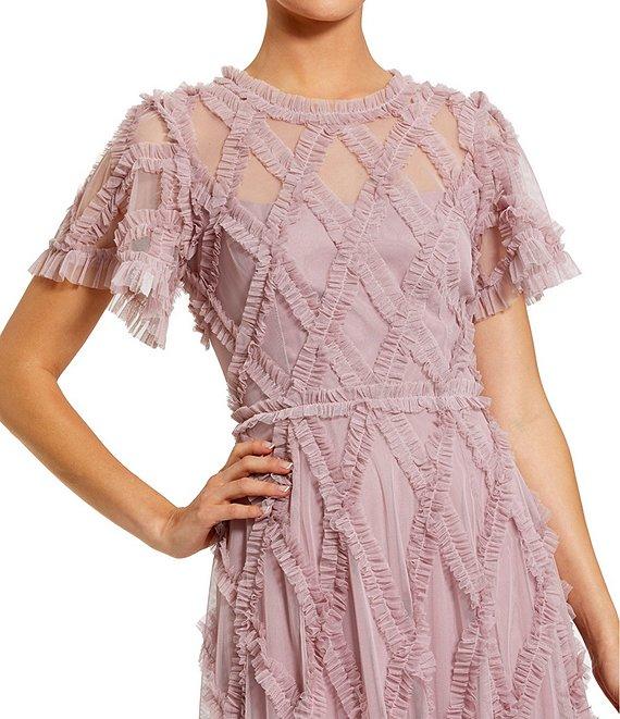 Mac Duggal Solid Mesh Dotted Ruffle Gown Dress