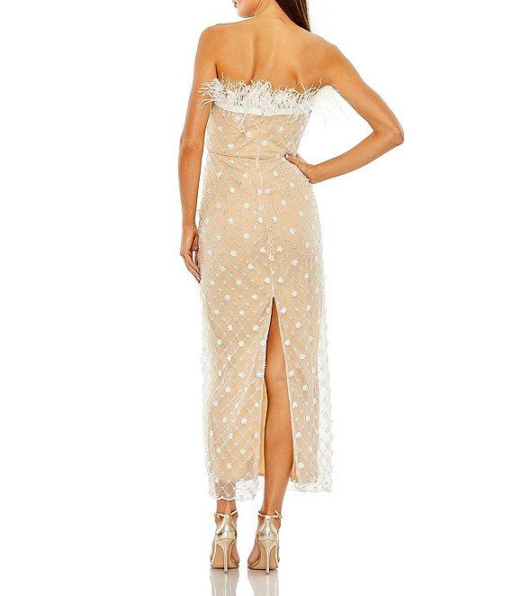 Mac Duggal Strapless Embellished Feather Trim Neckline Midi Dress